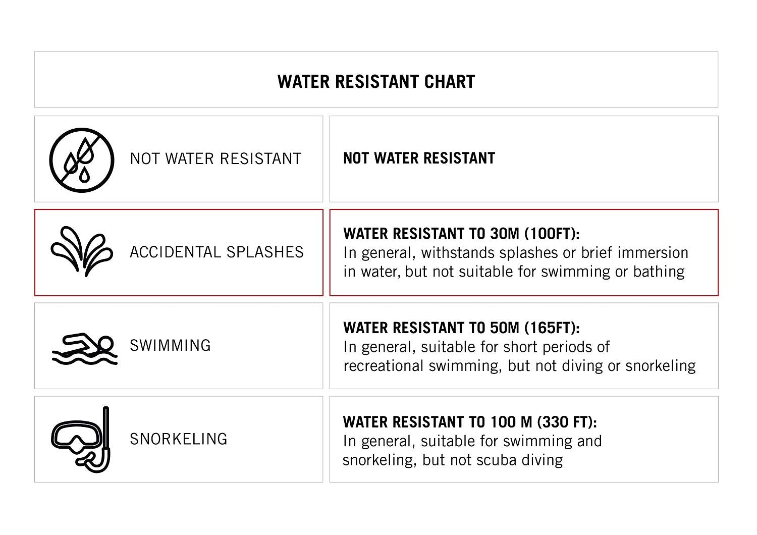 - Water resistant to 30 meters (99 feet): In general, withstands splashes or brief immersion in water, but not suitable for swimming or bathing