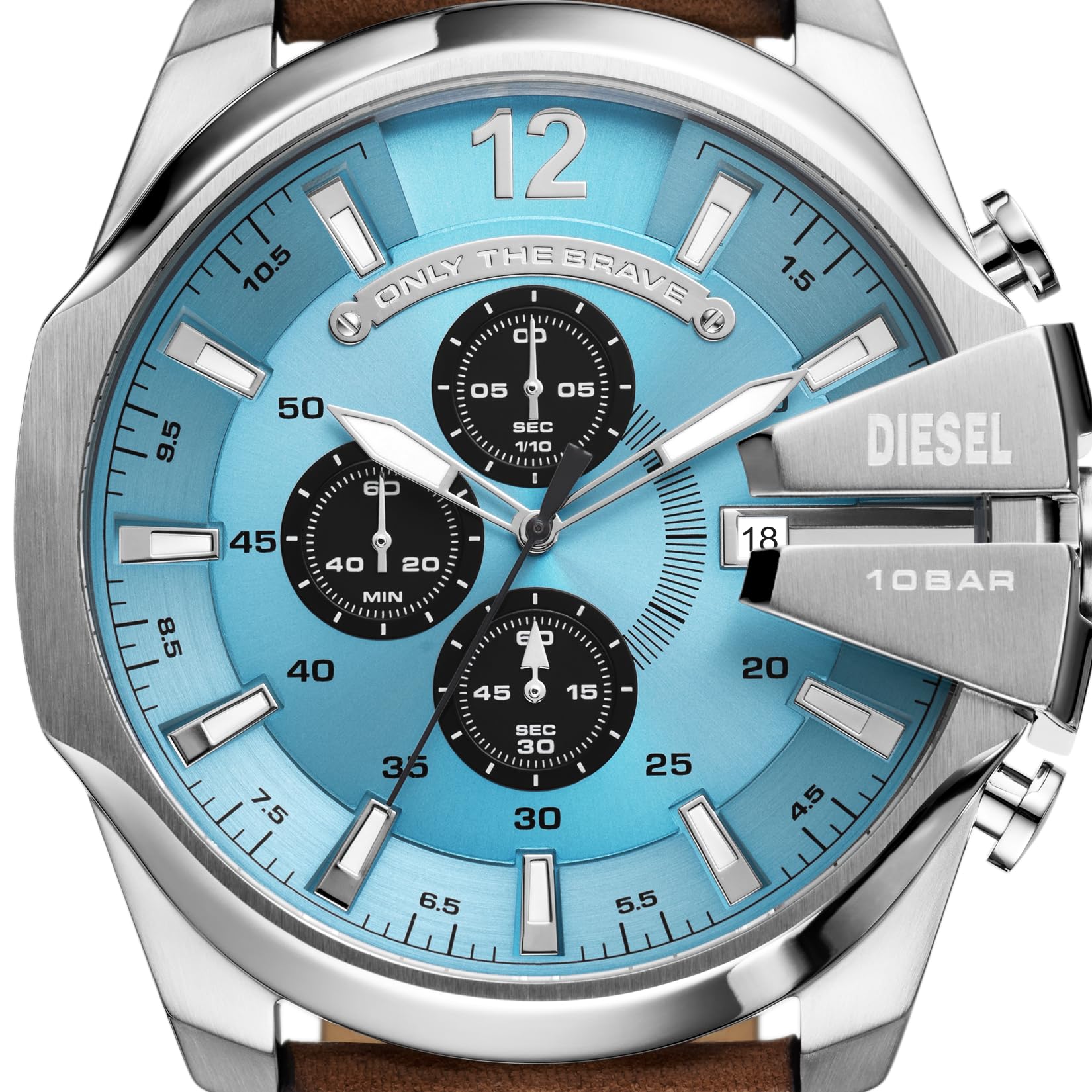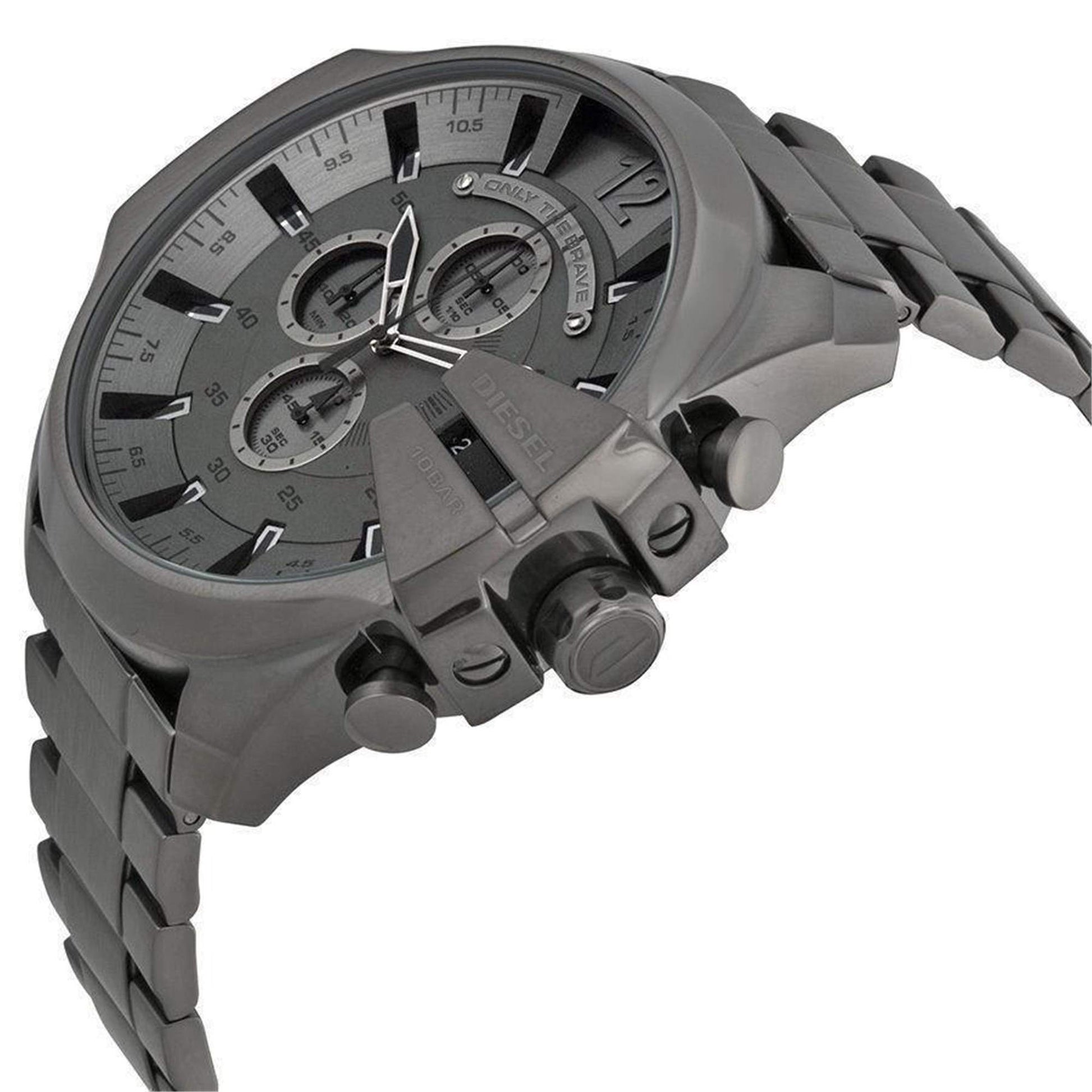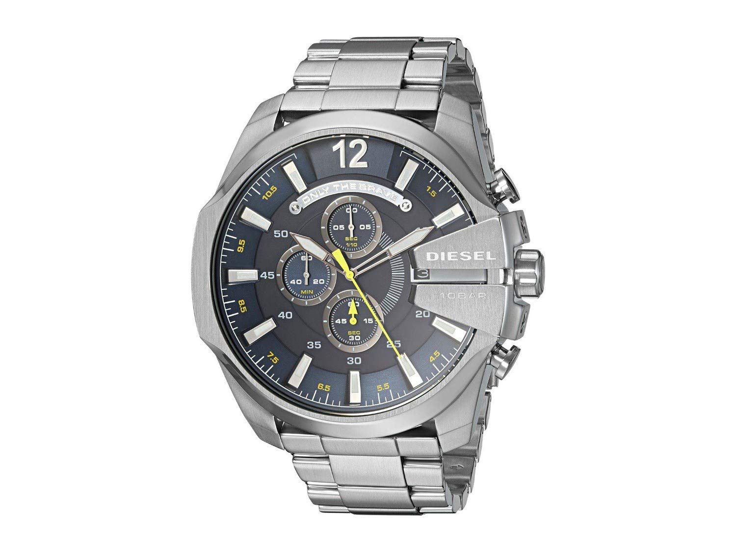 - The watch says it all: Only The Brave. When you wear those words featured on a Diesel Mega Chief chronograph dial, you show the world how you live each minute. In fact, the watch's three sub-dials track minutes, seconds, and tenths of seconds.