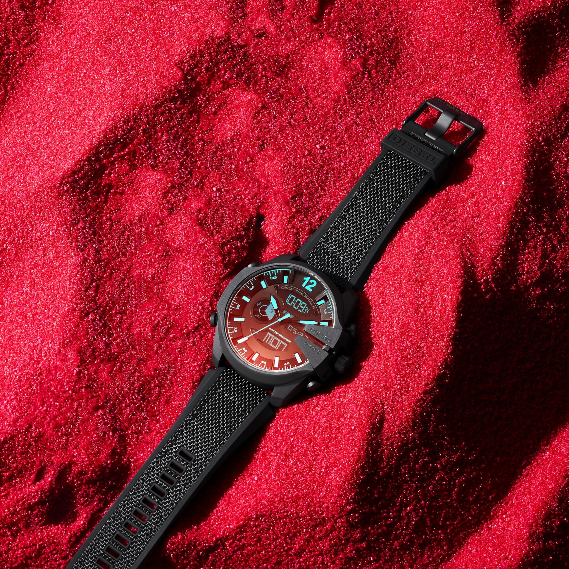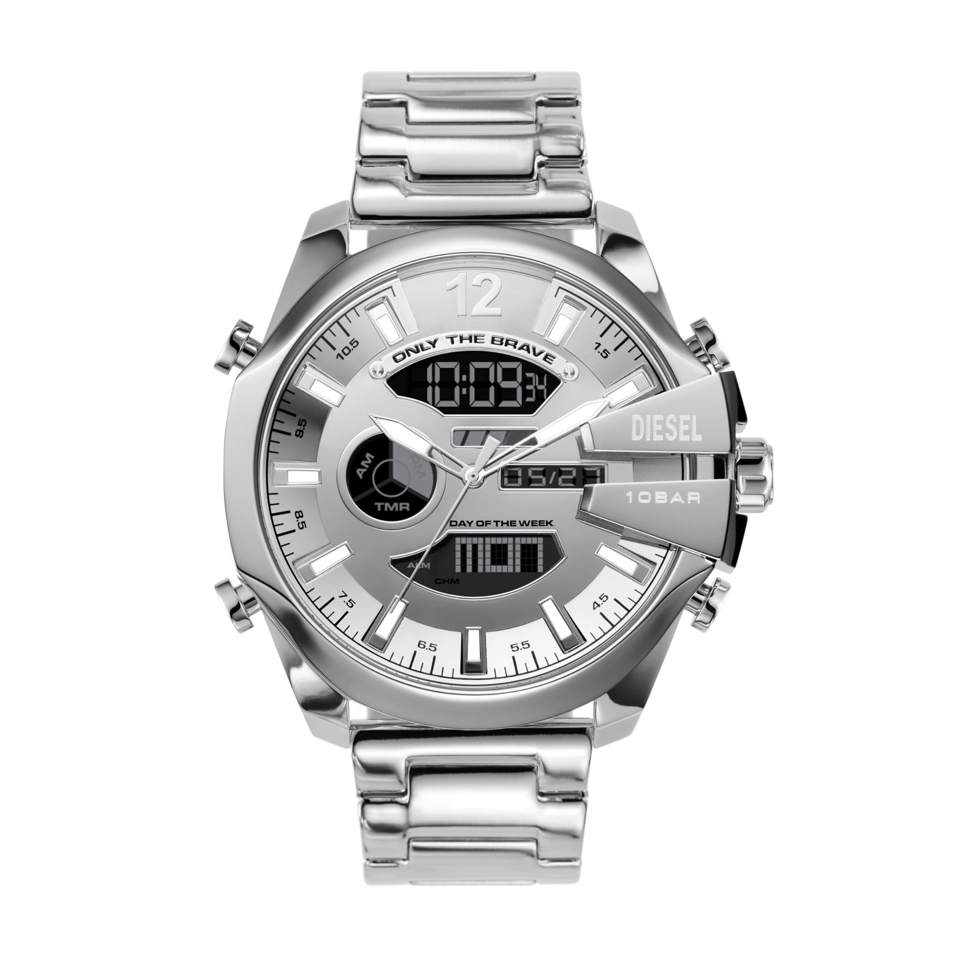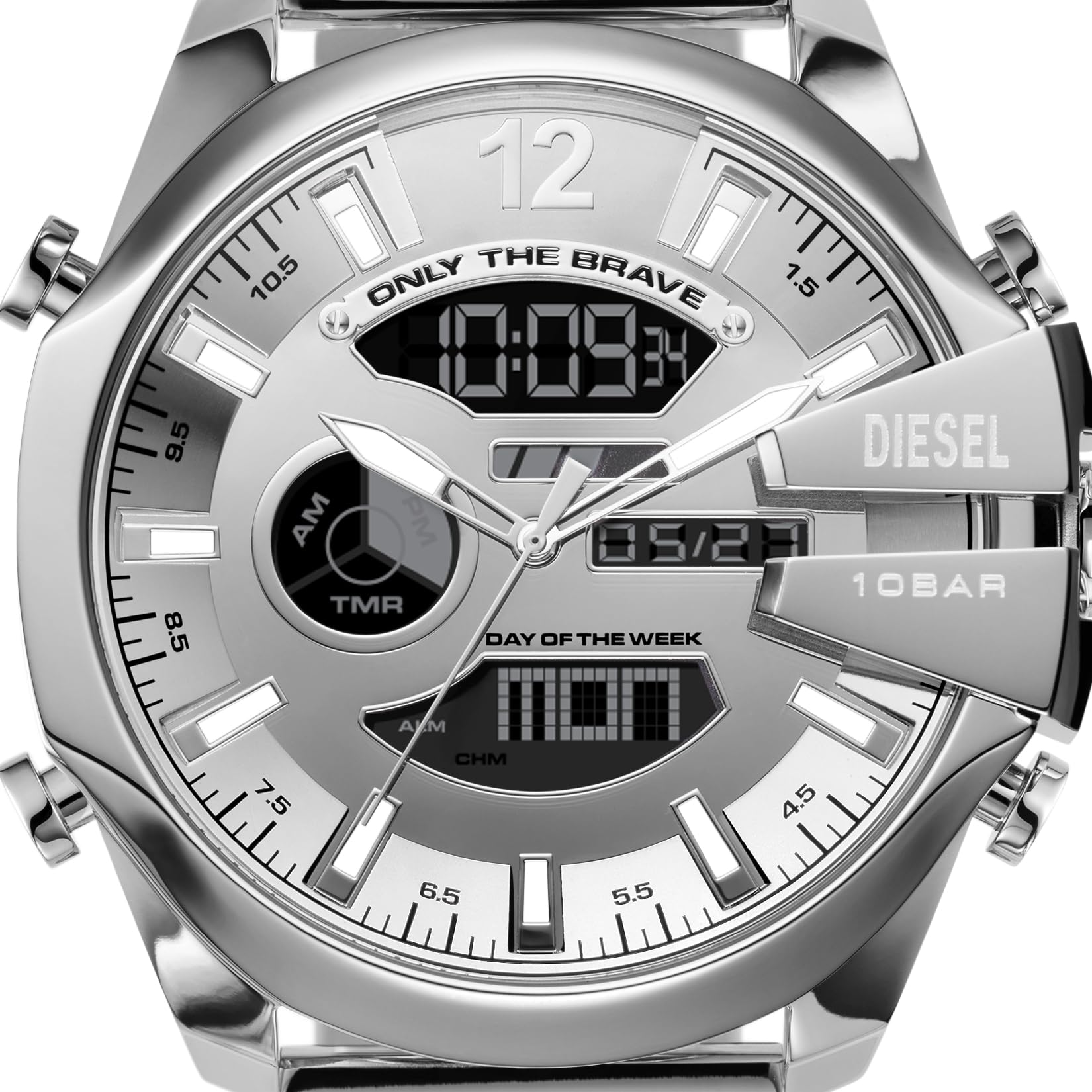- The watch says it all: Only The Brave. When you wear those words featured on a Diesel Mega Chief chronograph dial, you show the world how you live each minute. In fact, the watch's three sub-dials track minutes, seconds, and tenths of seconds.