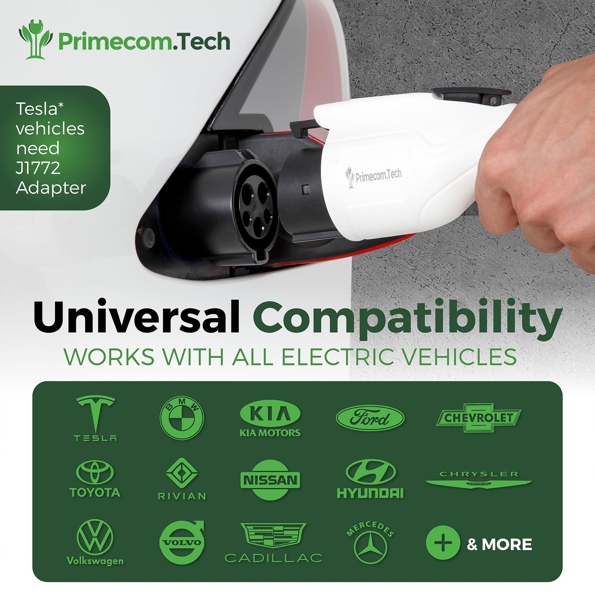 - UNIVERSAL COMPATIBILITY Works with all brand EV and PHEVs : but for Toyota Prius & RAV4 please call us first for special non standard J1772 plugs. Up to 4 times FASTER CHARGING speed PRIMECOM Level 2 chargers function at 16 Amps working within an automatic range of 100V-240V works with all brand EVs & PHEVs & Plug-in Hybrids. This 16 Amp model charges at 3.84kw/hour giving upto 15 miles of range per hour! If you need 40/ 50-feet length 32/40Amp chargers