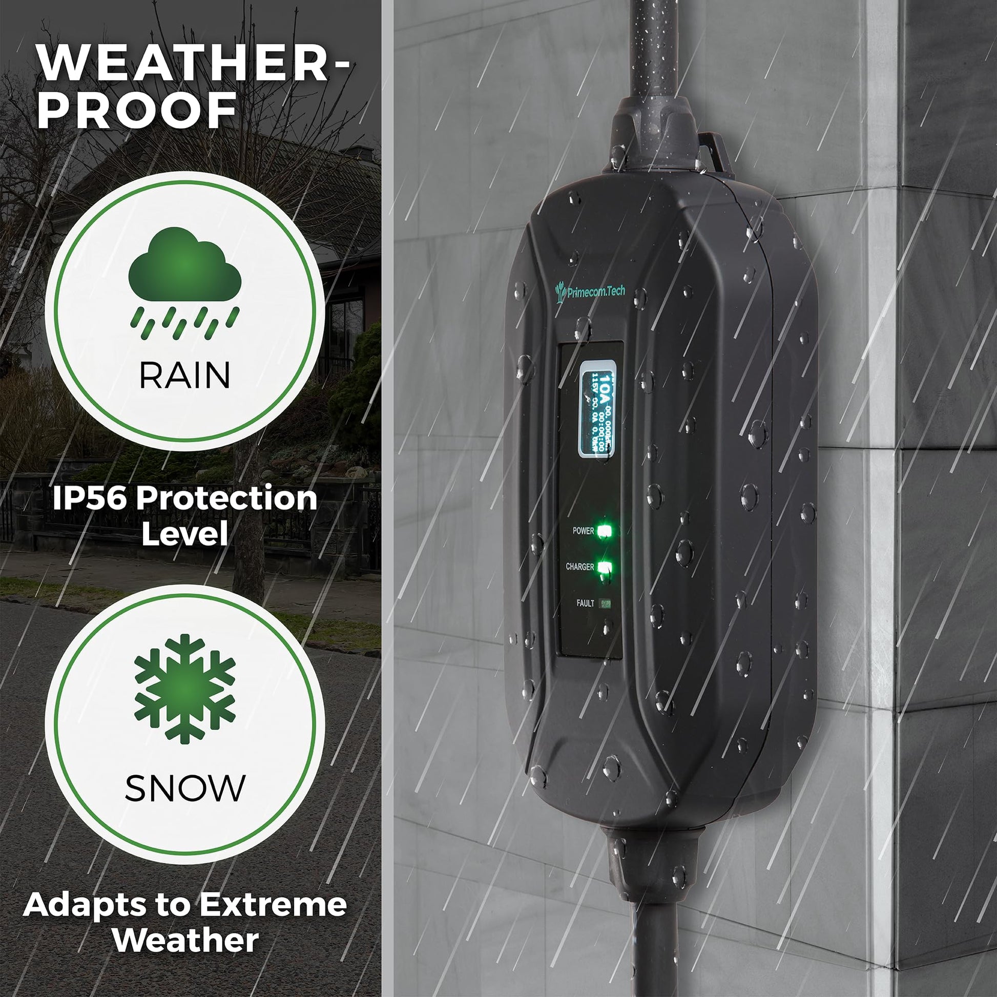 - SAFE AND SECURE - Primecom Level 2 Chargers have passed multi point rigorous tests to ensure quality and safety measures. T V German Equipment and Product Safety Certification, CE️ certifications, UL️ Listed Cable Certifications, along with 12 other built in safety features such as, lightning-proof, leakage protection, overvoltage, overheat, overcurrent protection, UL94V-0 rating flame resistance, IP65 rating waterproof and are safe to use outdoors for snow, rain, dust...