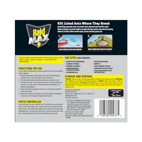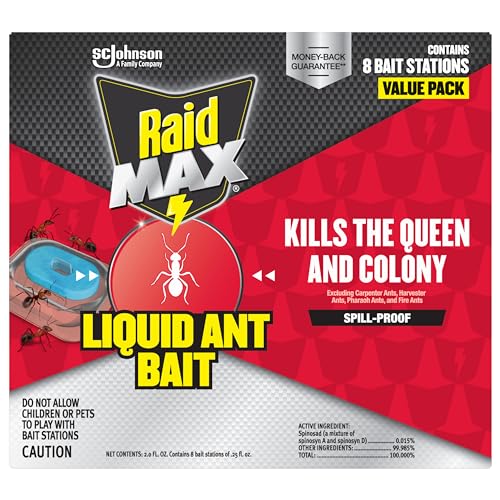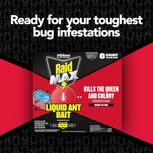 Raid Max Liquid Ant Bait quickly attracts & kills ants where they breed (excluding fire ants, carpenter ants, harvest ands and pharaoh ants). The pre-filled liquid ant bait is convenient and read-to-use. To use, place the Raid Max Liquid where ants are present. The bait works by ants consuming the liquid, in the bait, and taking it back into the colony where it is fed to other worker ants, larvae and the queen ant killing the colony. The ant bait can be used indoor and outdoors to control the following ants: foraging ants, sweet-feeding ants, pavement ants, moisture ants, little black ants, Argentine ants, crazy ants, acrobat ants, bigheaded ants, cornfield ants, ghost ants, odorous house ants, thief ants, Texas leafcutting ants, field ants, and other common ants (excluding fire ants, carpenter ants, harvester ants, and pharaoh ants). Raid. Protecting families from bugs for over 60 years. *See the label for details