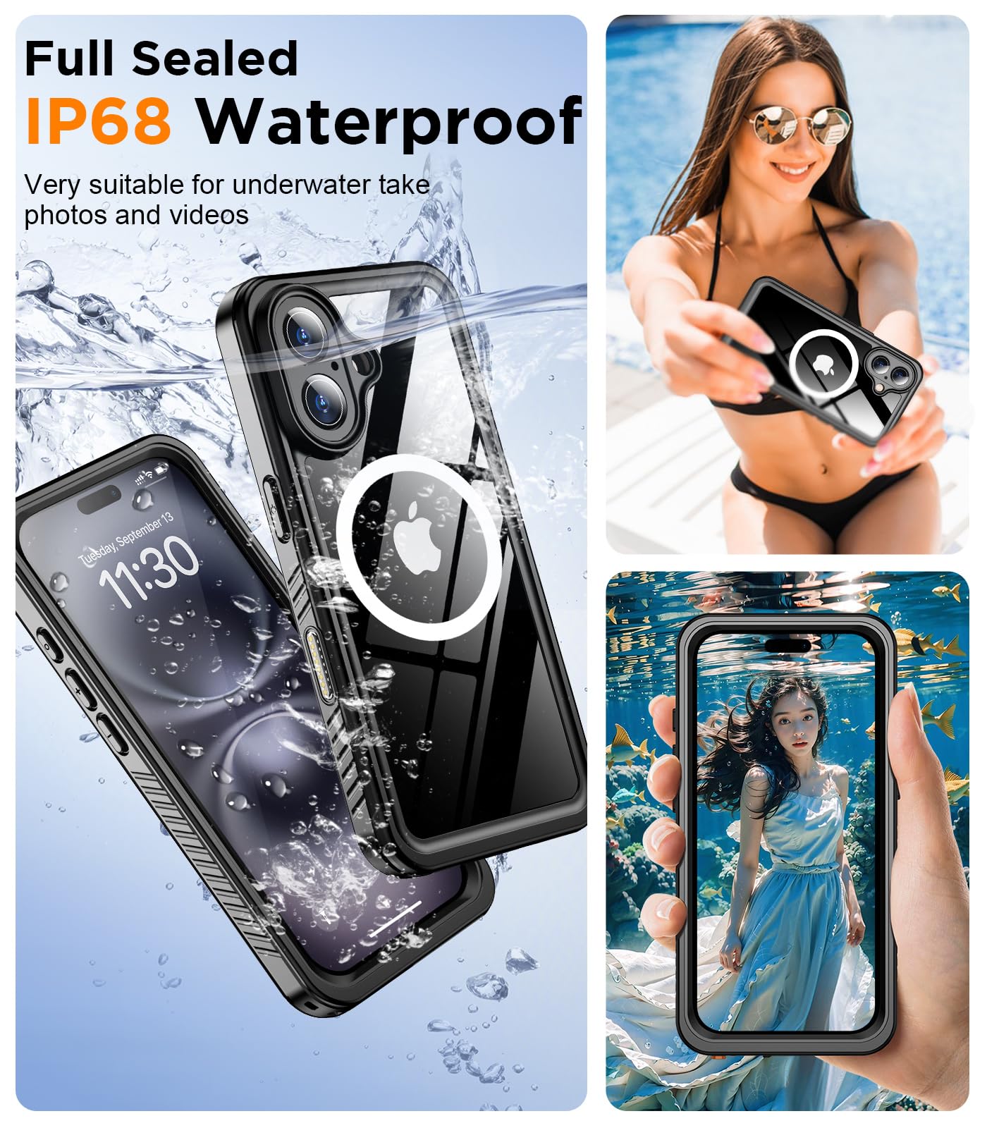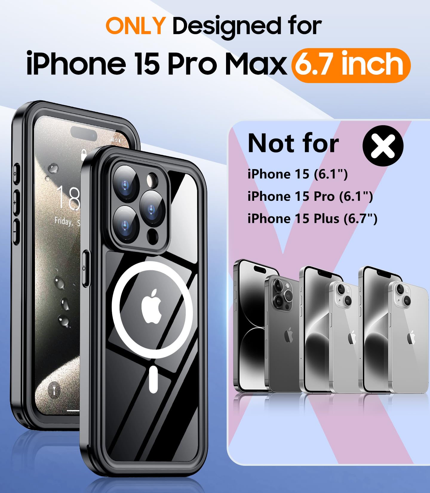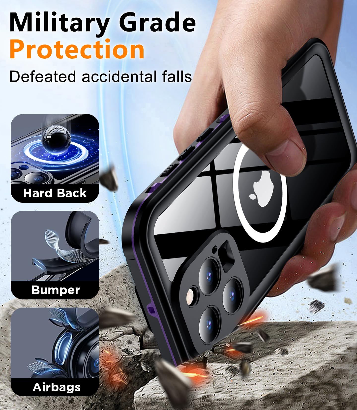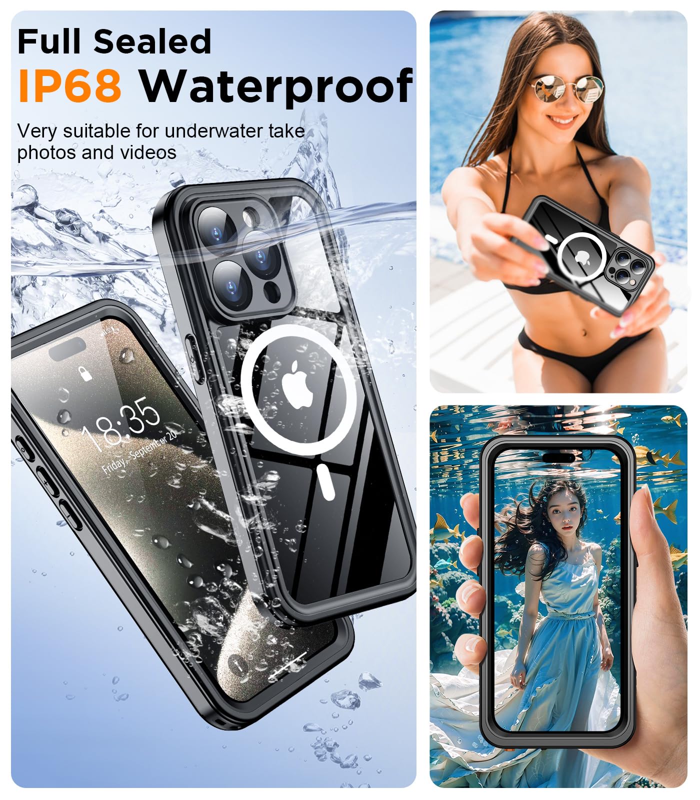 Temdan Magnetic for iPhone 16 Pro Max Case Waterproof,Built-in Screen Protector[IP68 Underwater][Upgrade Military Dropproof][Compatible with MagSafe] Full-Body Shockproof Translucent Case 6.9''-Black
