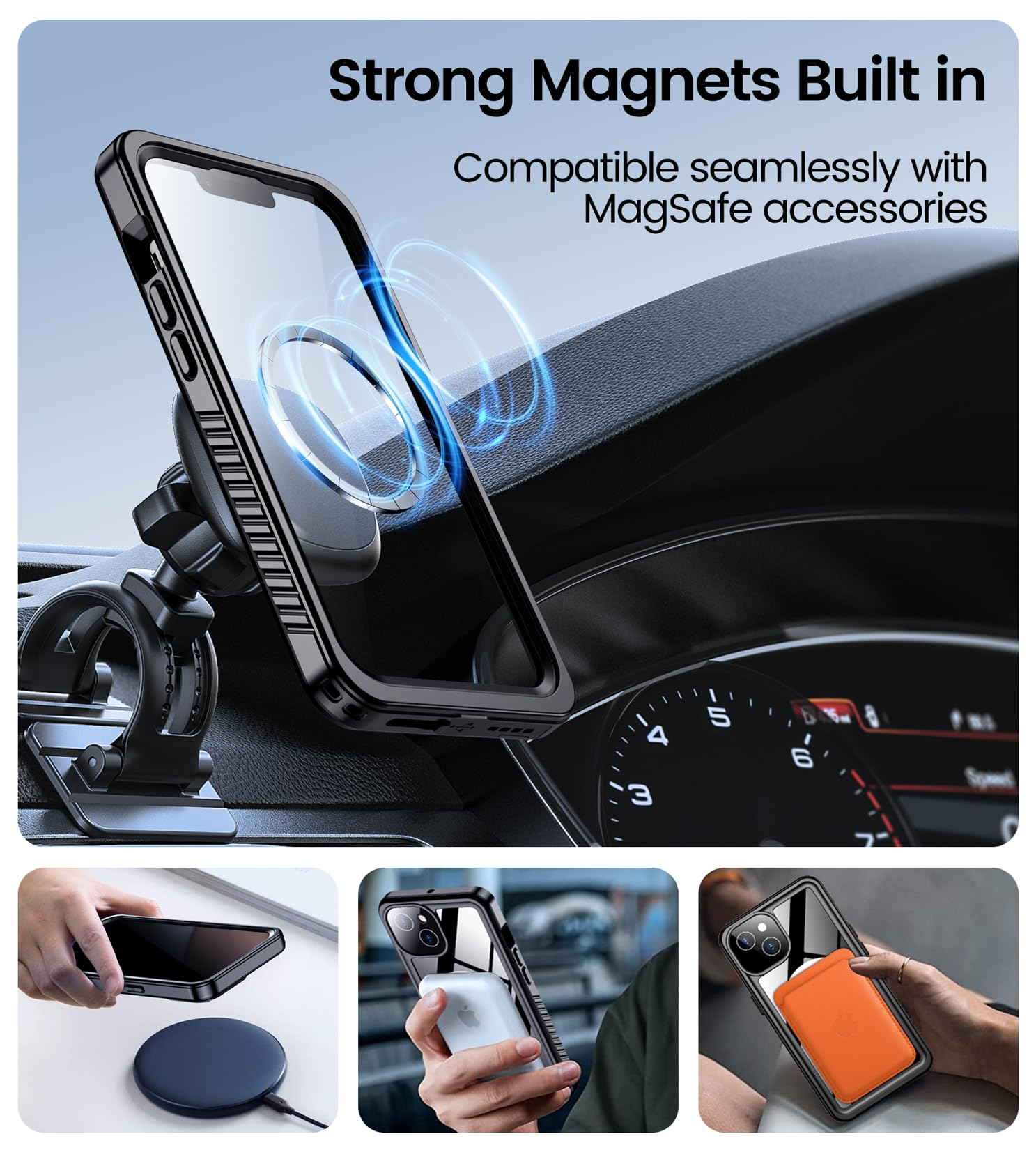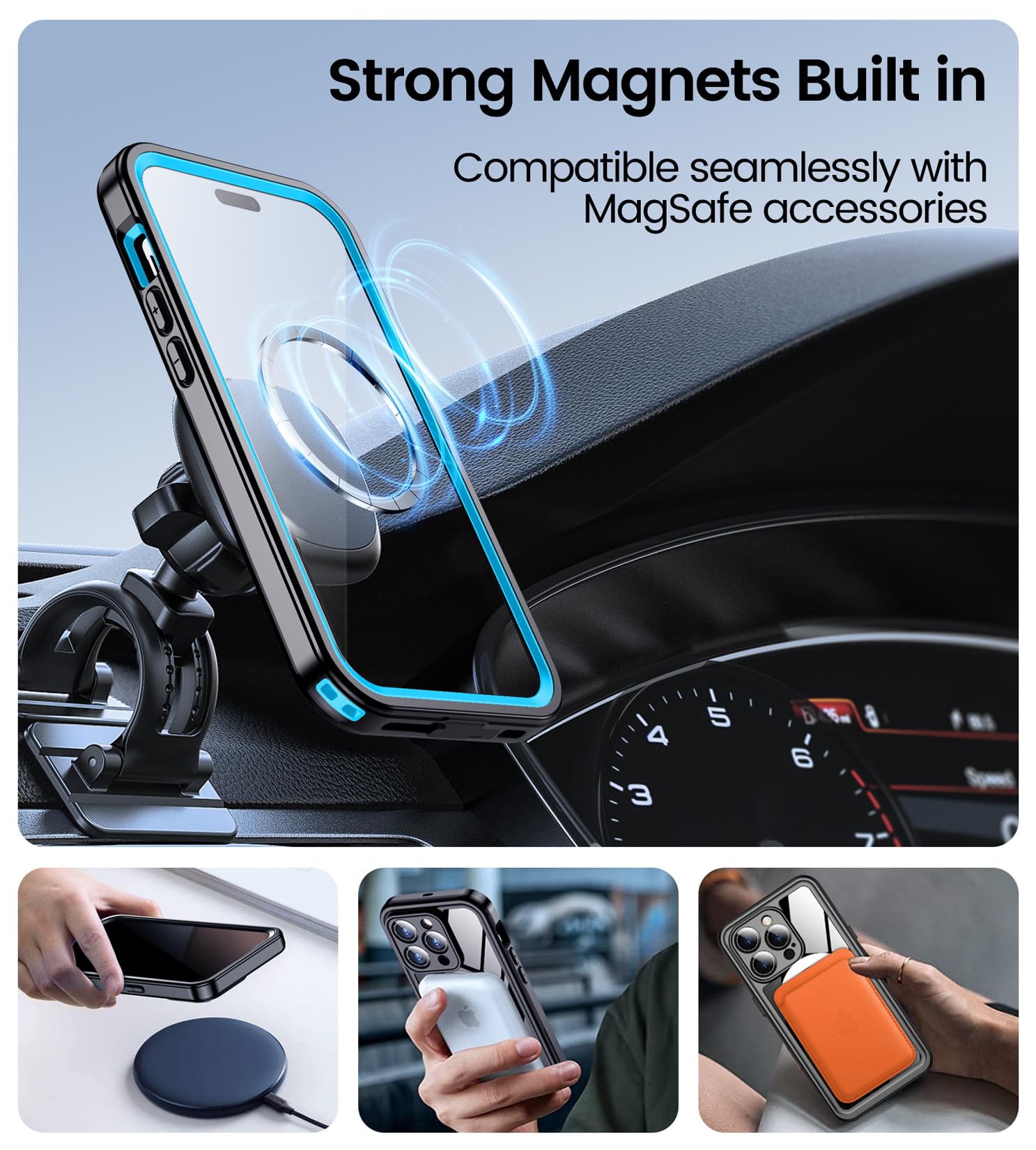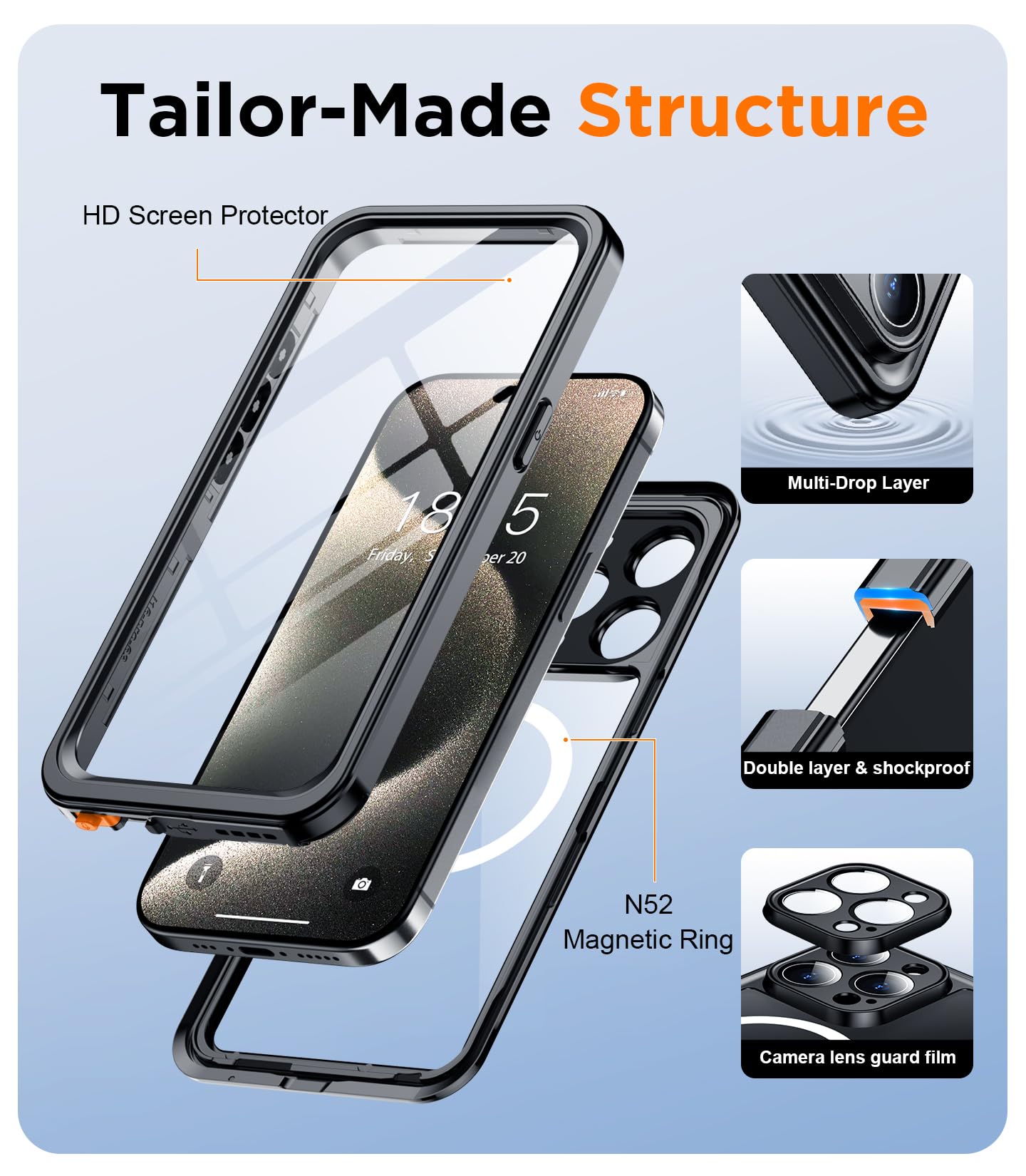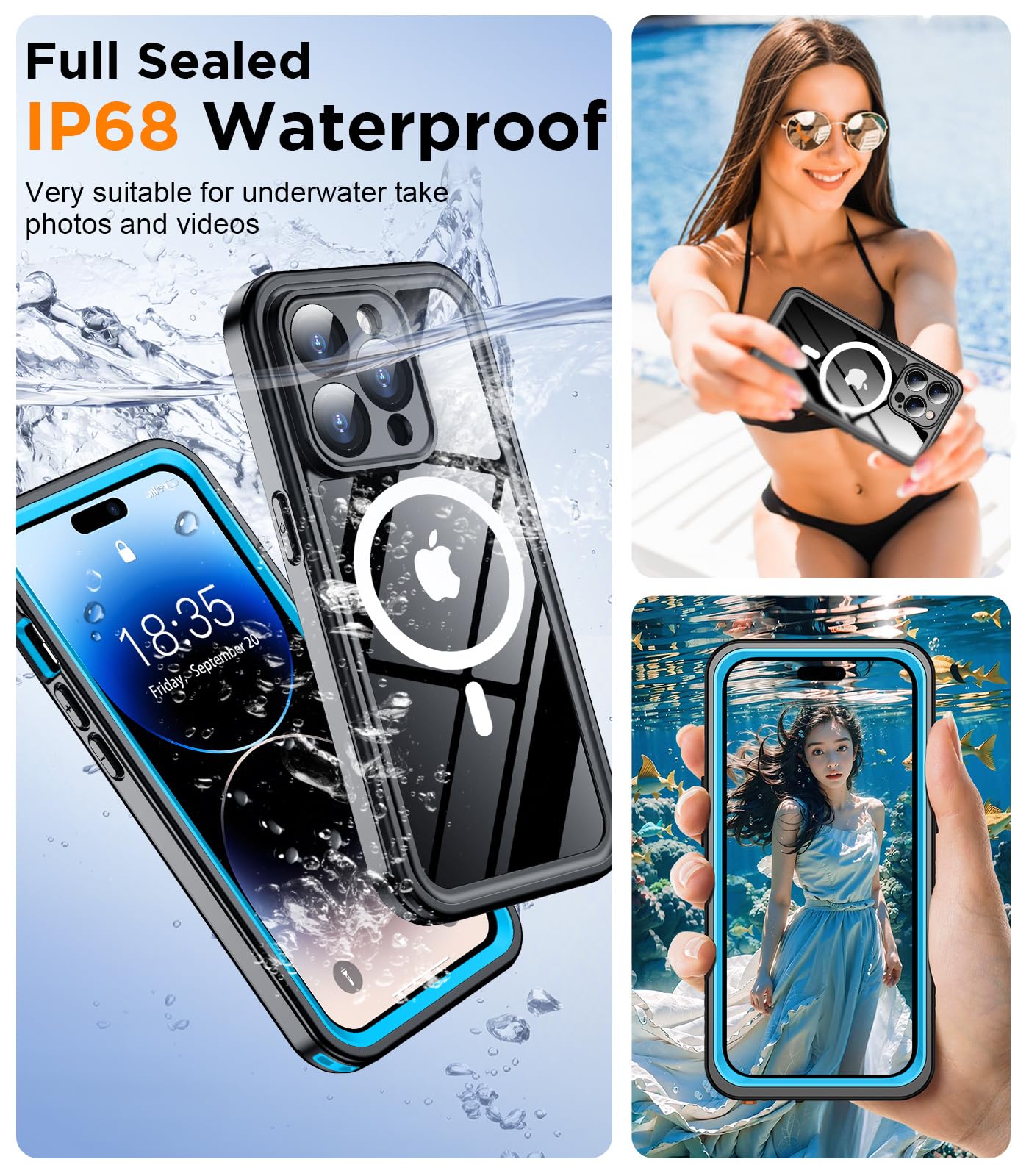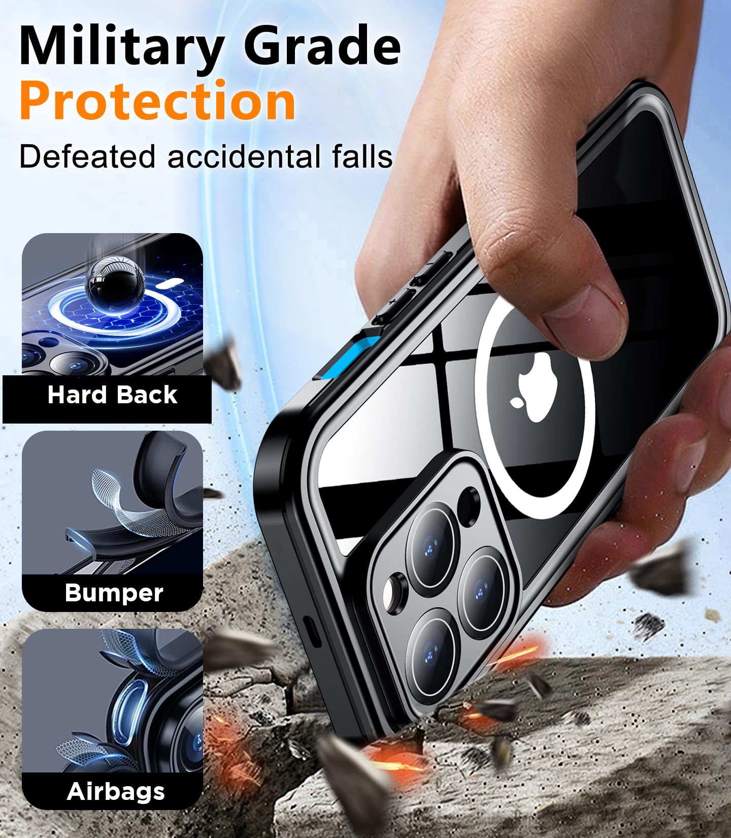 Temdan Magnetic for iPhone 16 Pro Max Case Waterproof,Built-in Screen Protector[IP68 Underwater][Upgrade Military Dropproof][Compatible with MagSafe] Full-Body Shockproof Translucent Case 6.9''-Black