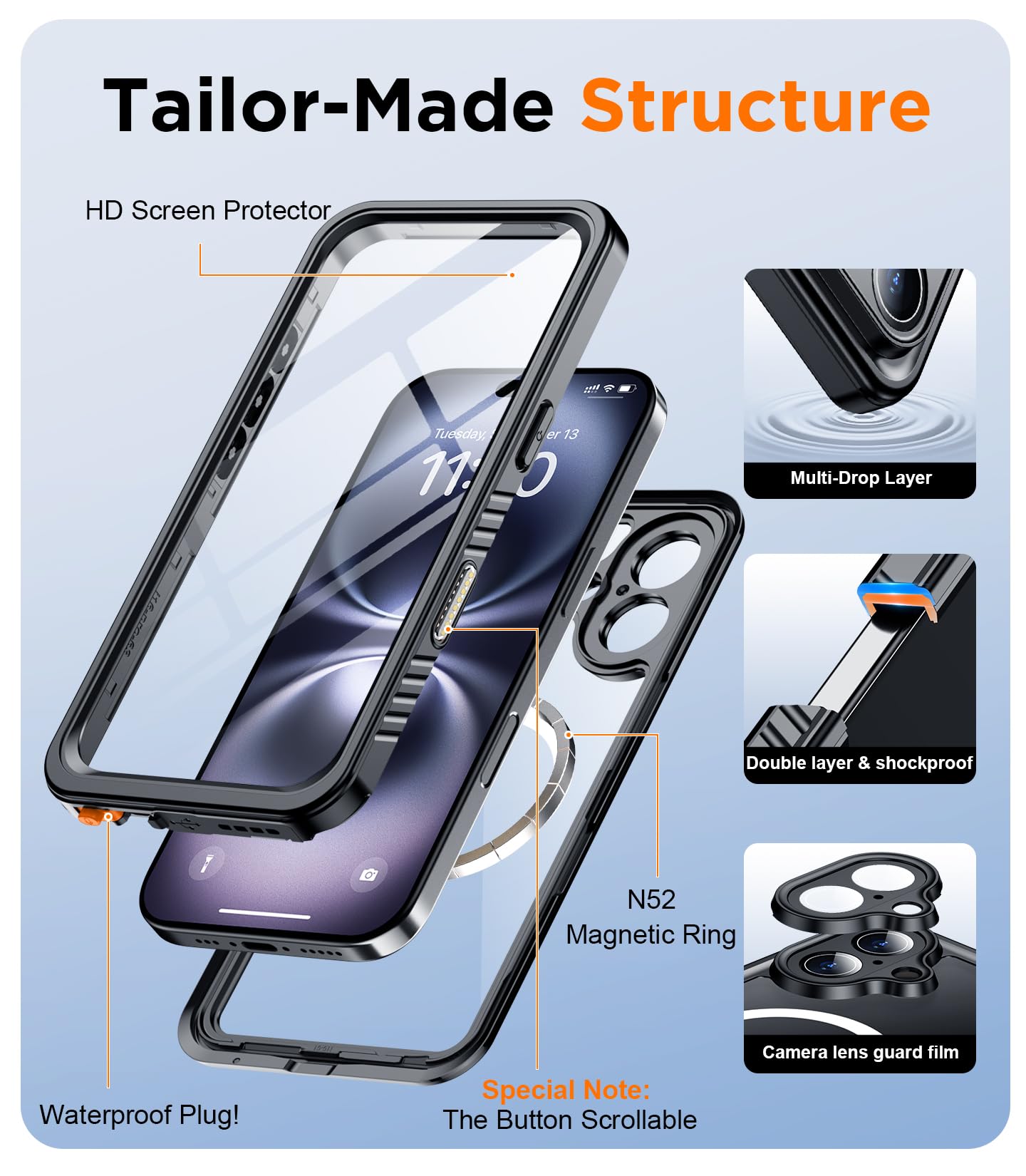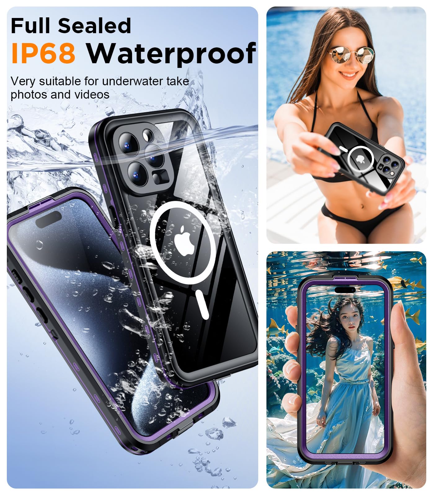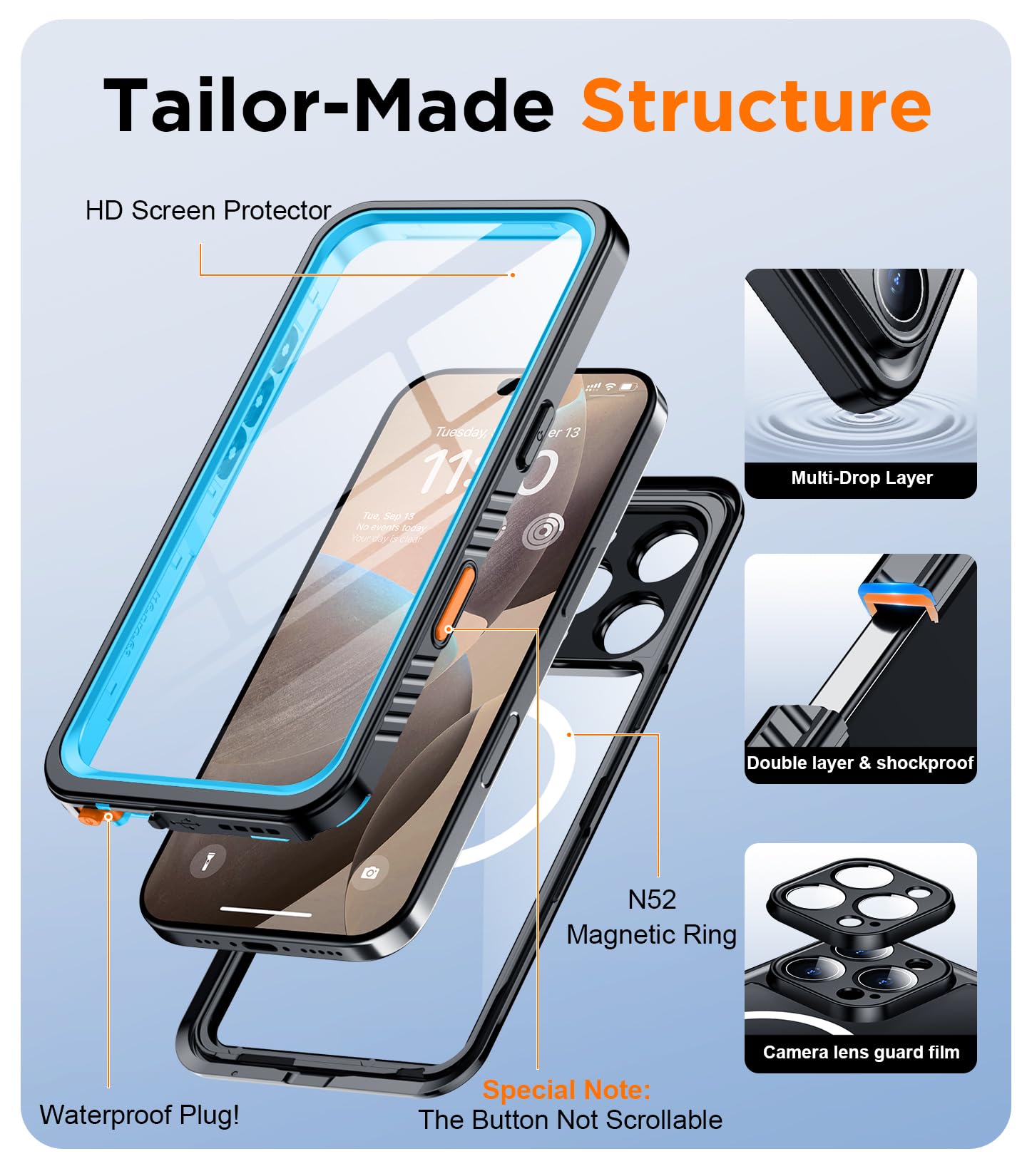 - 【IP68 Waterproof】The iPhone 16 Pro Max case is certified with an IP68 waterproof rating, allowing it to be submerged up to 10ft/3m for one hour while providing protection against dust, dirt, water, snow, and rain. Its comprehensive body protection design enables underwater photography and videography. Additionally, the washable feature facilitates easy cleaning, ensuring that both your phone and case maintain a pristine appearance while safeguarding against scratches and fading