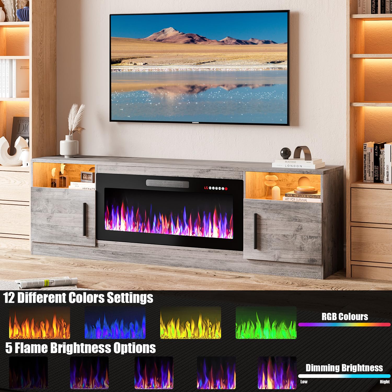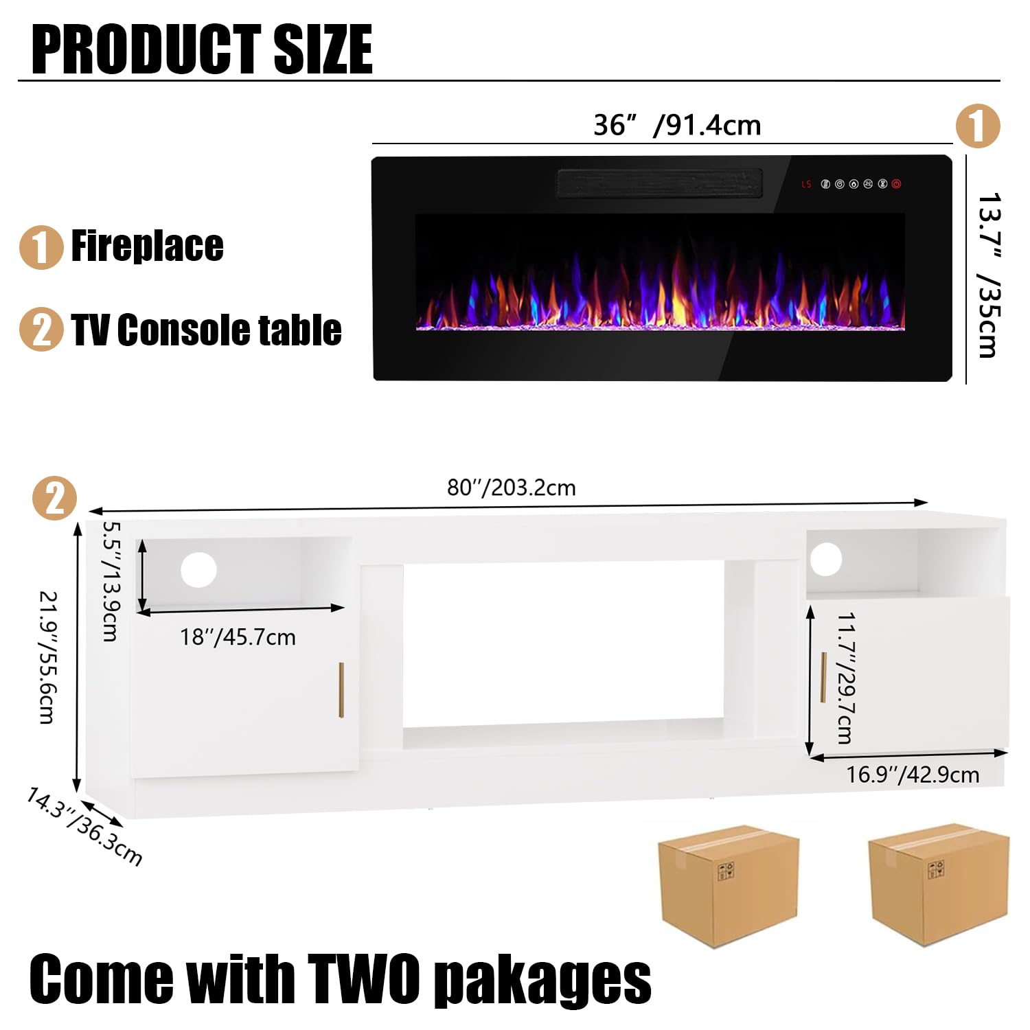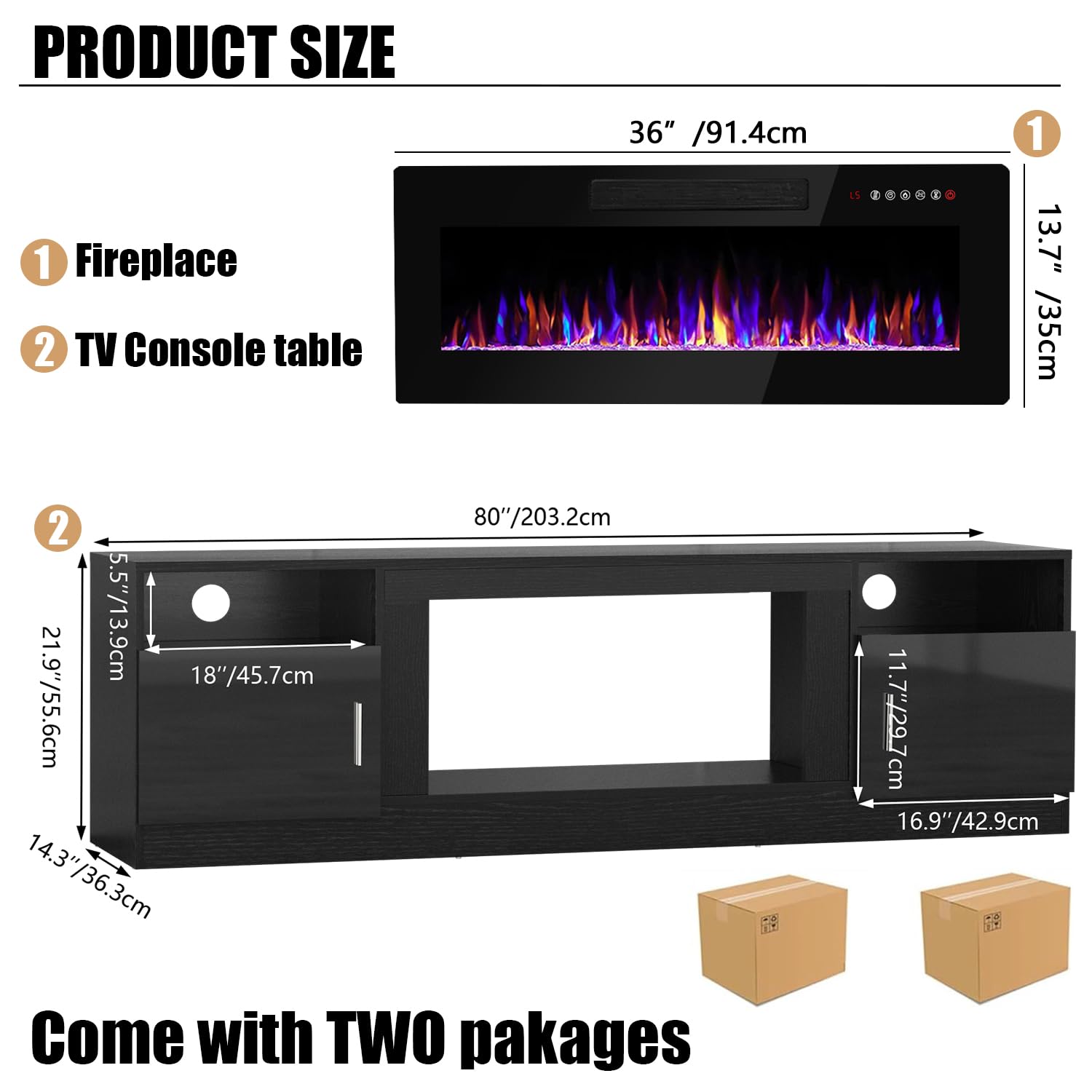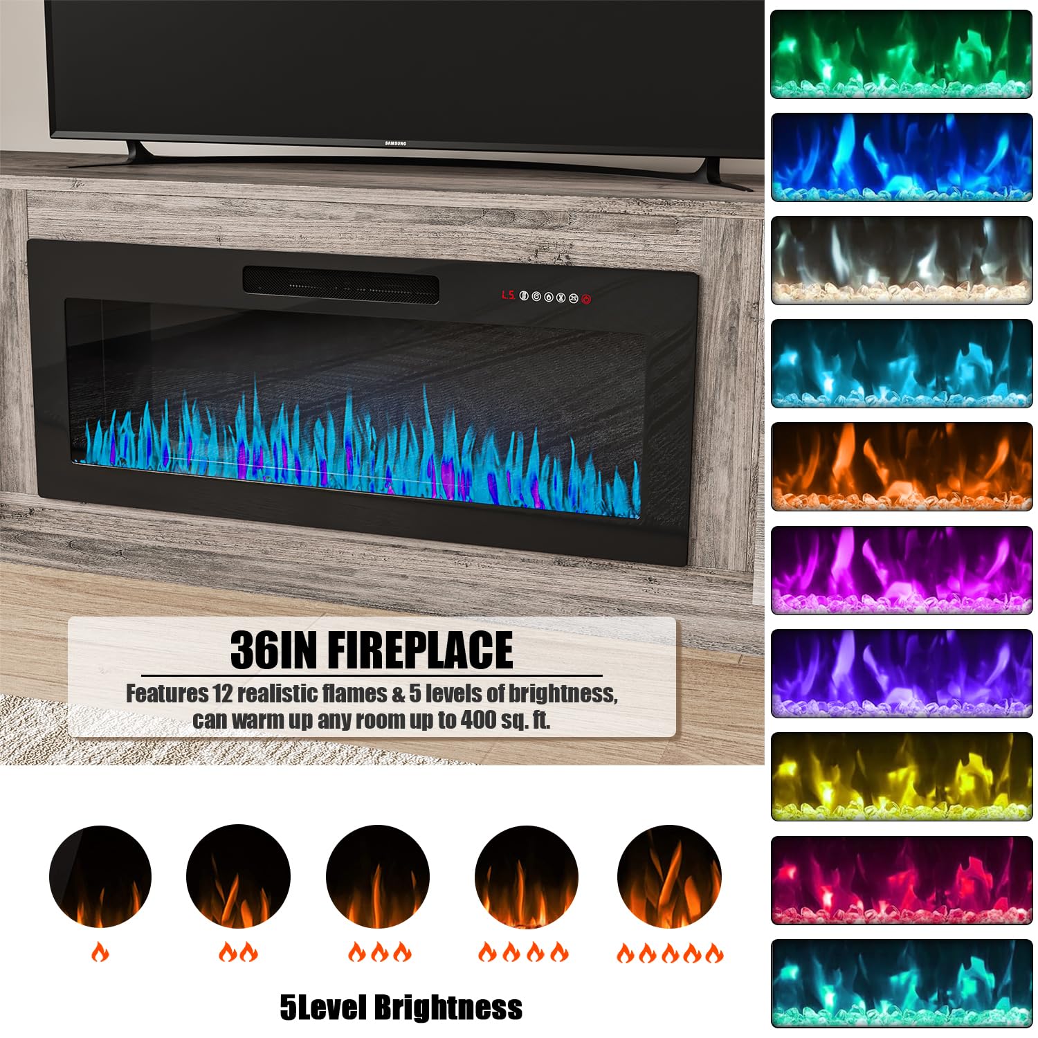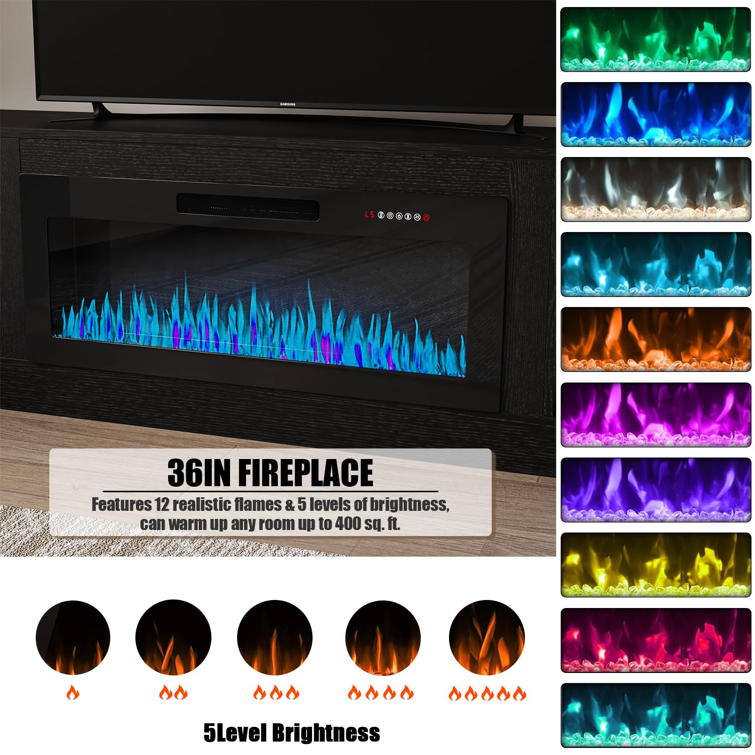 - [TV Stand with Electric Fireplace] :Adopting a 2-in-1 design, combining the TV Stand with the electric fireplace. TV cabinet for TVs up to 80”, and the desktop can bear up to 300 pounds. It comes with a 36-inch electric fireplace,can heat up to a 400-square-foot room, adjustable between 750 watts and 1,500 watts. Make the TV placement more stable and provide a better viewing experience. The electric fireplace has 12 types of flames, and the speed and brightness of 5 types of flames can be adjusted, allowing you to customize various atmospheres.