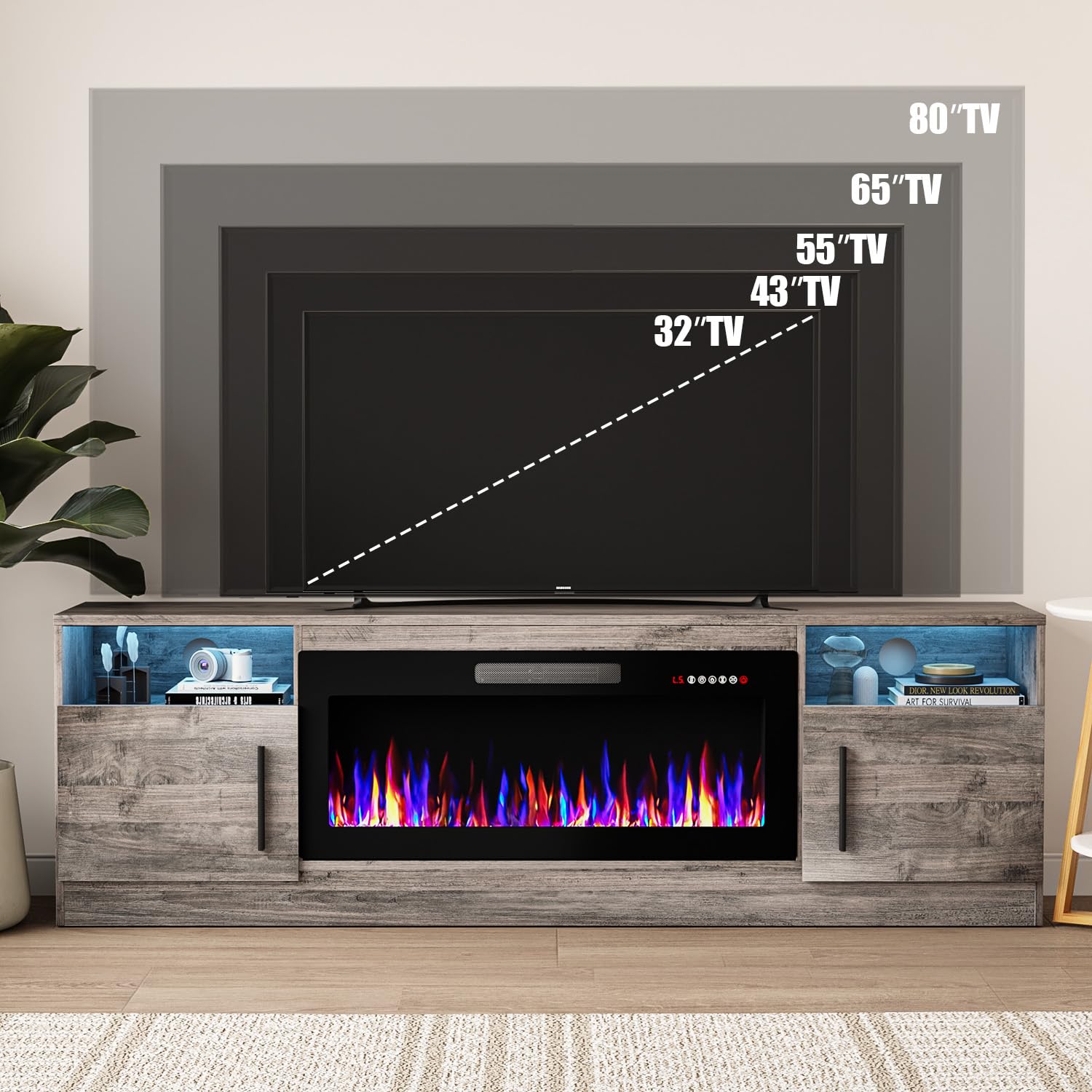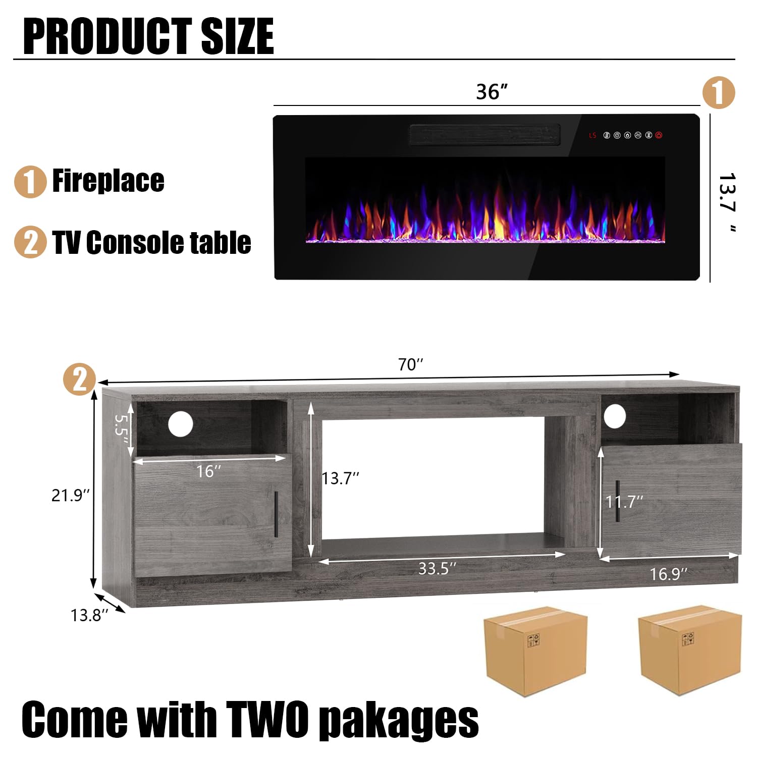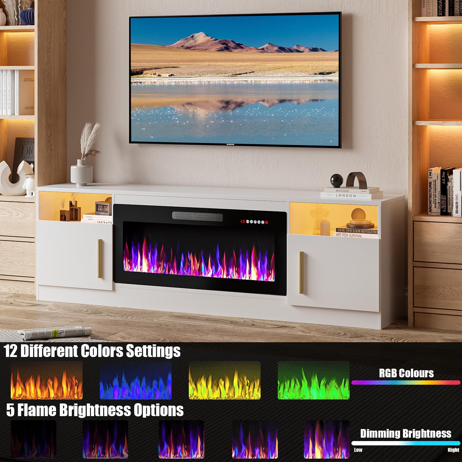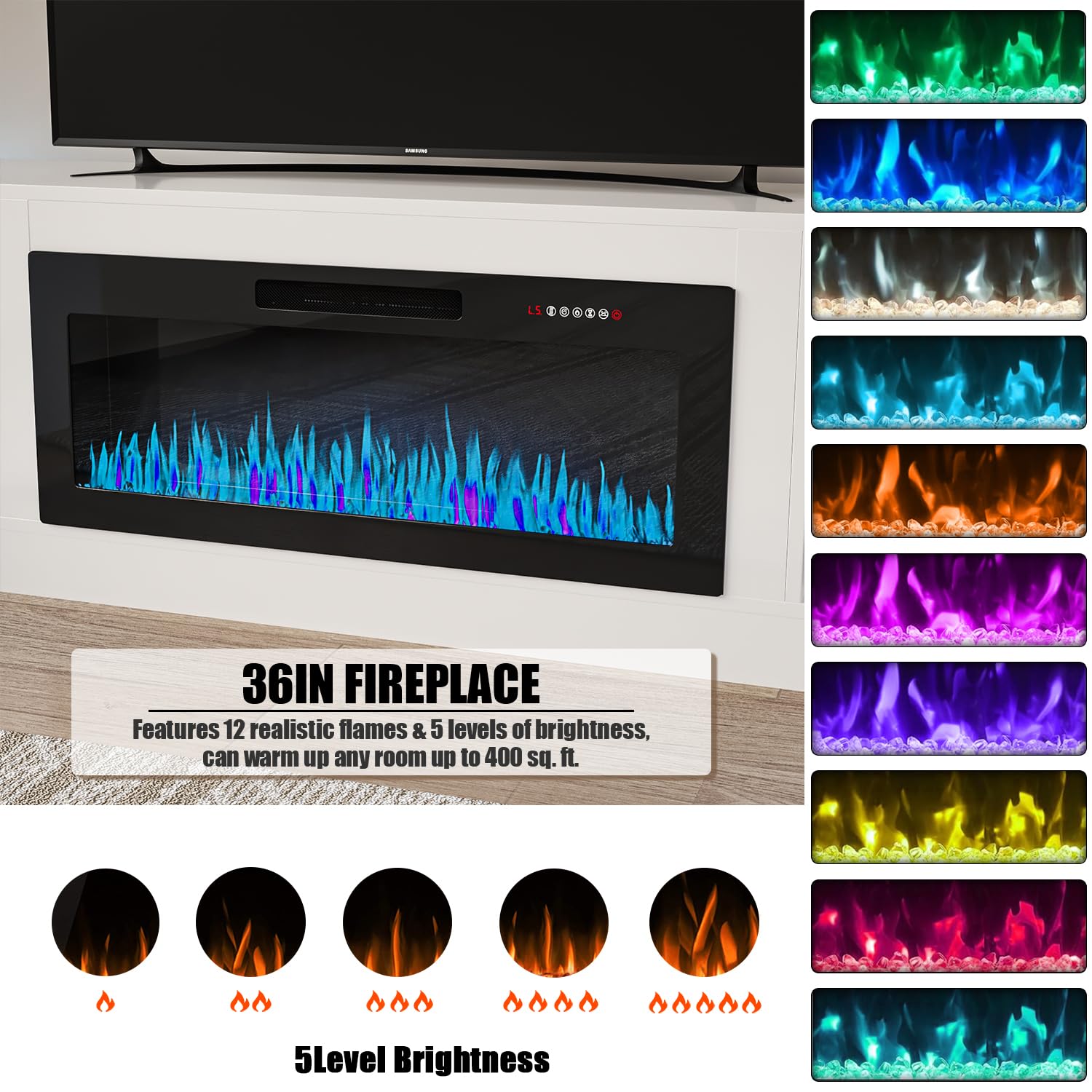 - [TV Stand with Electric Fireplace] :Adopting a 2-in-1 design, combining the TV Stand with the electric fireplace. TV cabinet for TVs up to 80”, and the desktop can bear up to 300 pounds. It comes with a 36-inch electric fireplace,can heat up to a 400-square-foot room, adjustable between 750 watts and 1,500 watts. Make the TV placement more stable and provide a better viewing experience. The electric fireplace has 12 types of flames, and the speed and brightness of 5 types of flames can be adjusted, allowing you to customize various atmospheres.