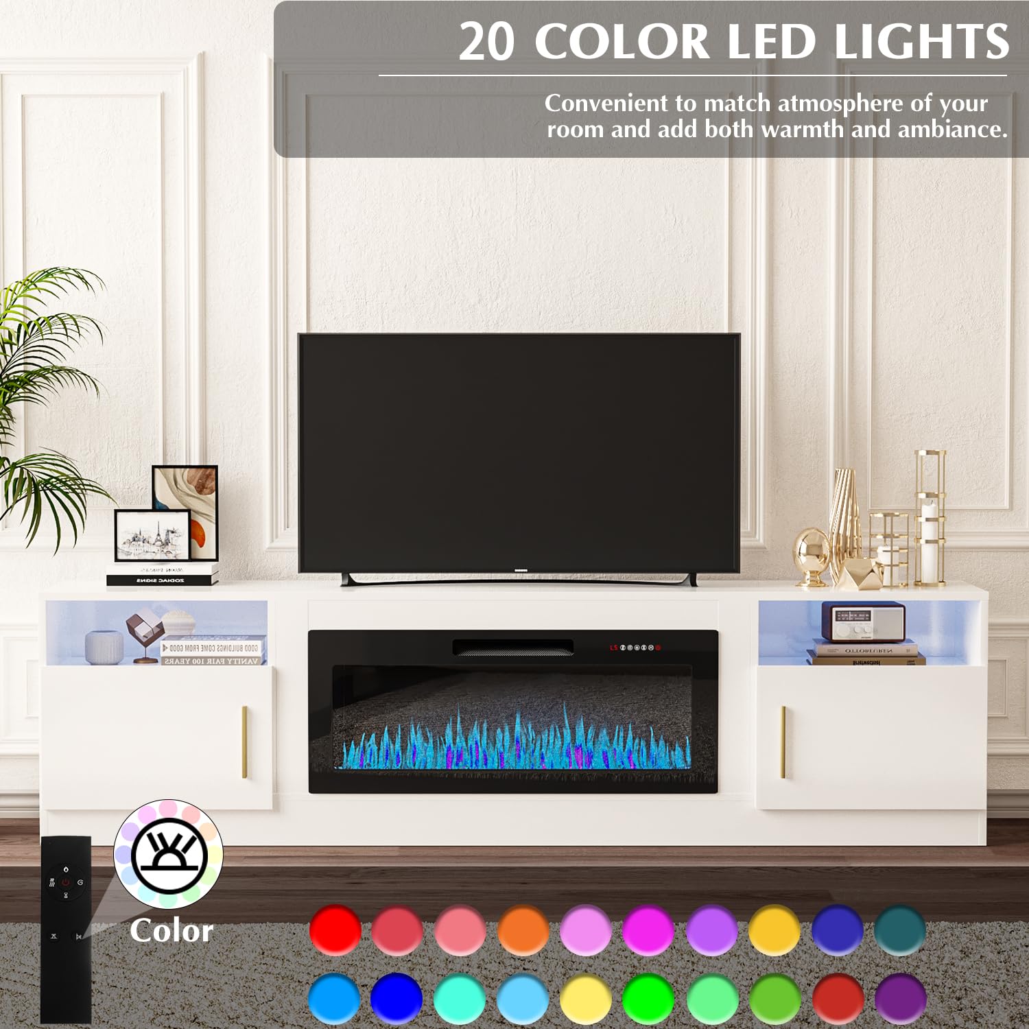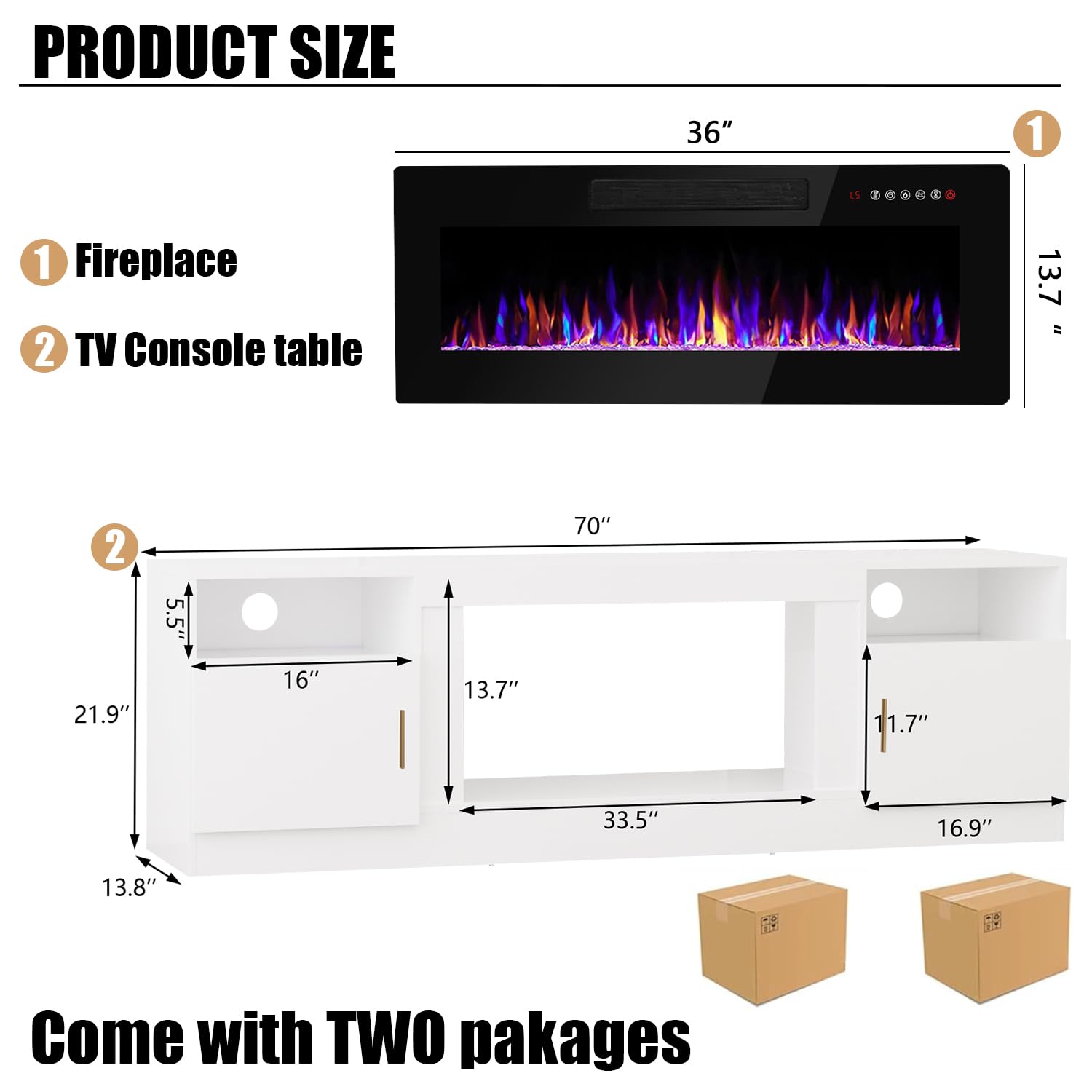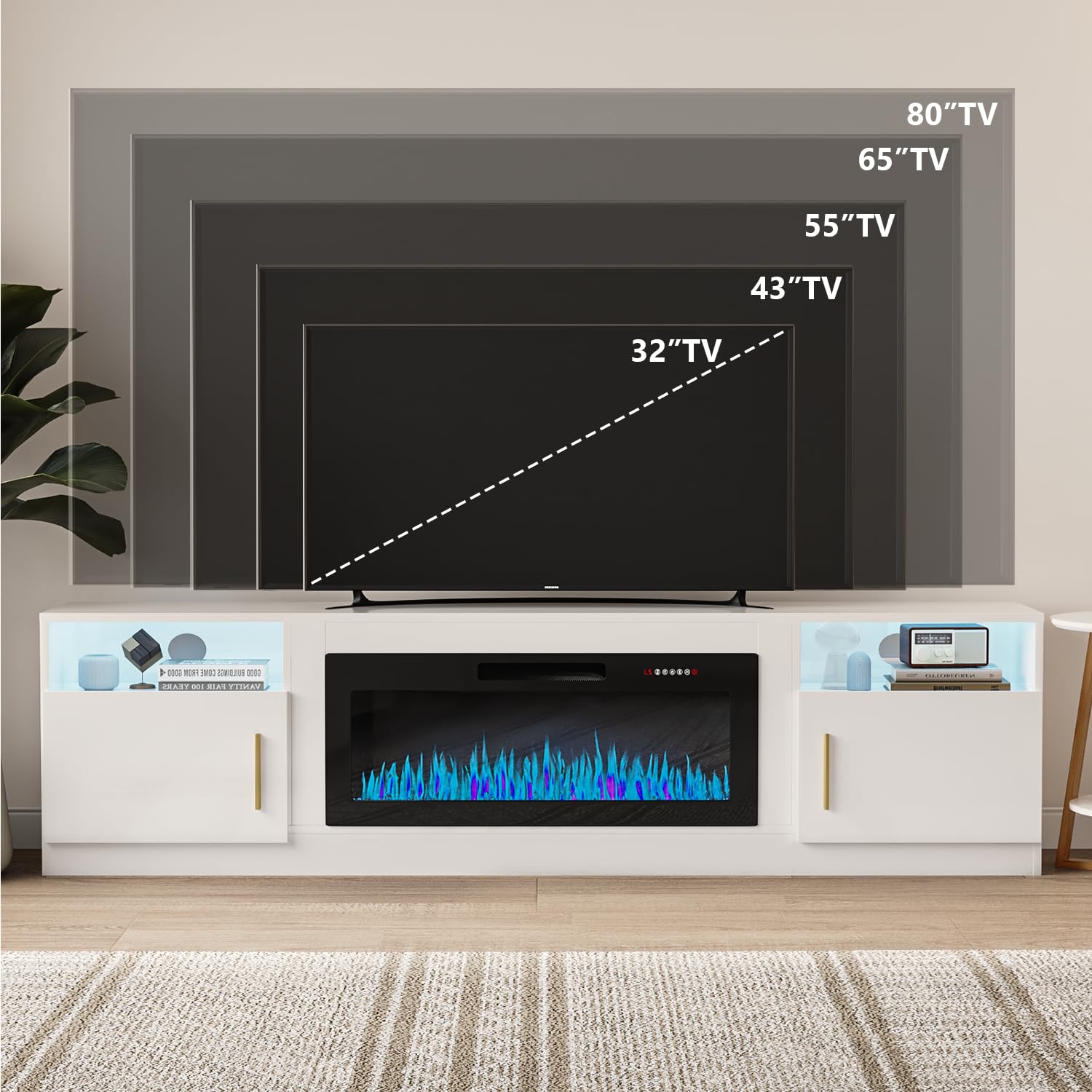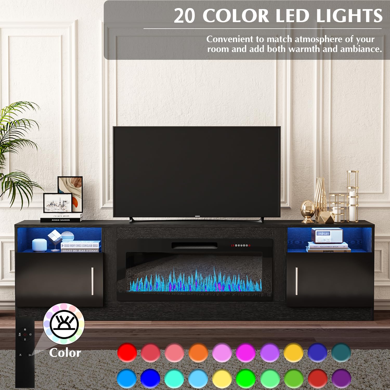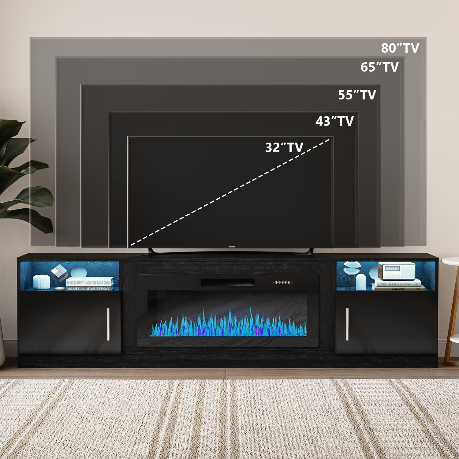 - [TV Stand with Electric Fireplace] :Adopting a 2-in-1 design, combining the TV Stand with the electric fireplace. TV cabinet for TVs up to 80”, and the desktop can bear up to 300 pounds. It comes with a 36-inch electric fireplace,can heat up to a 400-square-foot room, adjustable between 750 watts and 1,500 watts. Make the TV placement more stable and provide a better viewing experience. The electric fireplace has 12 types of flames, and the speed and brightness of 5 types of flames can be adjusted, allowing you to customize various atmospheres.