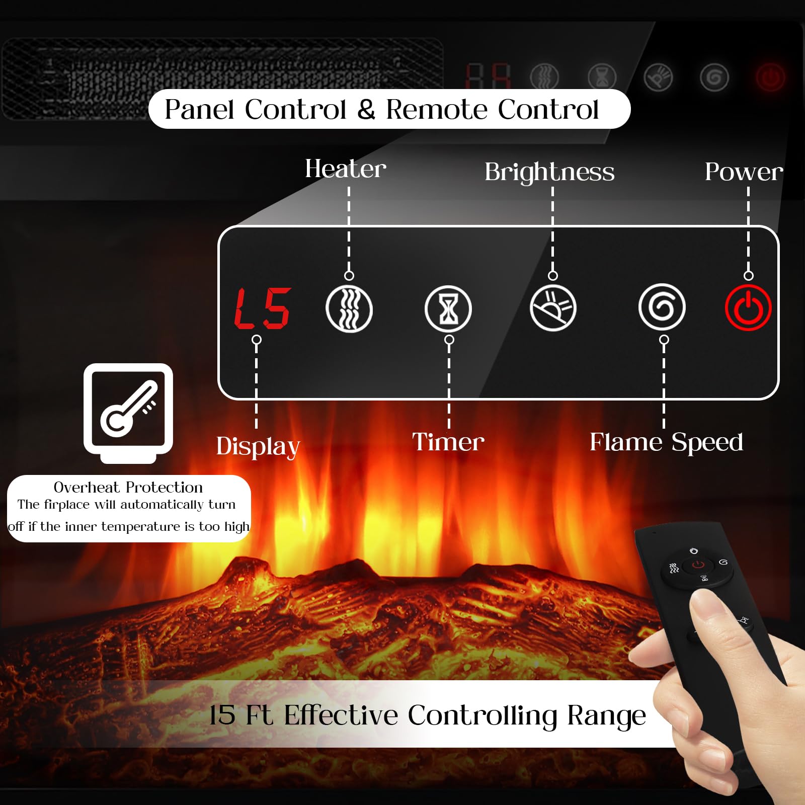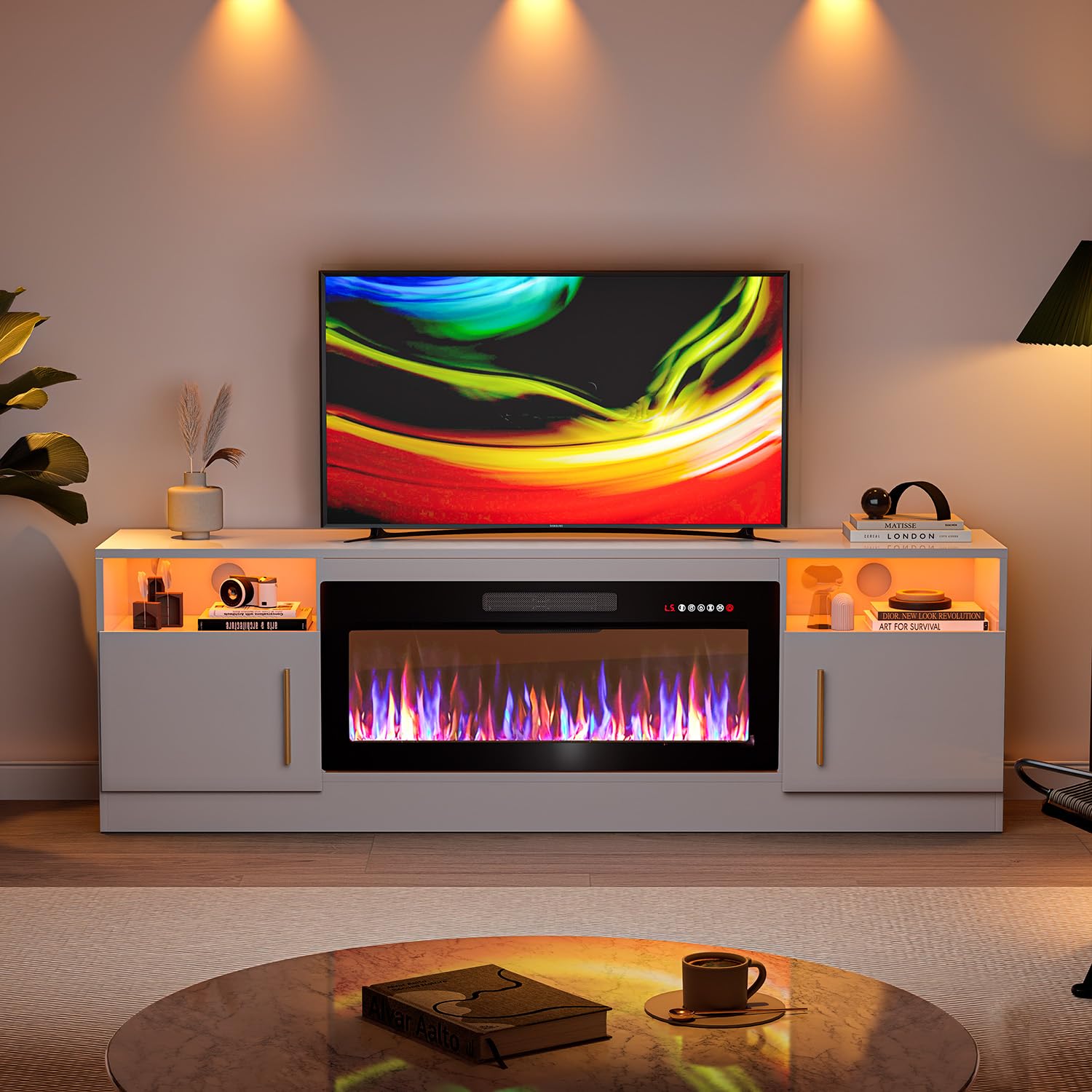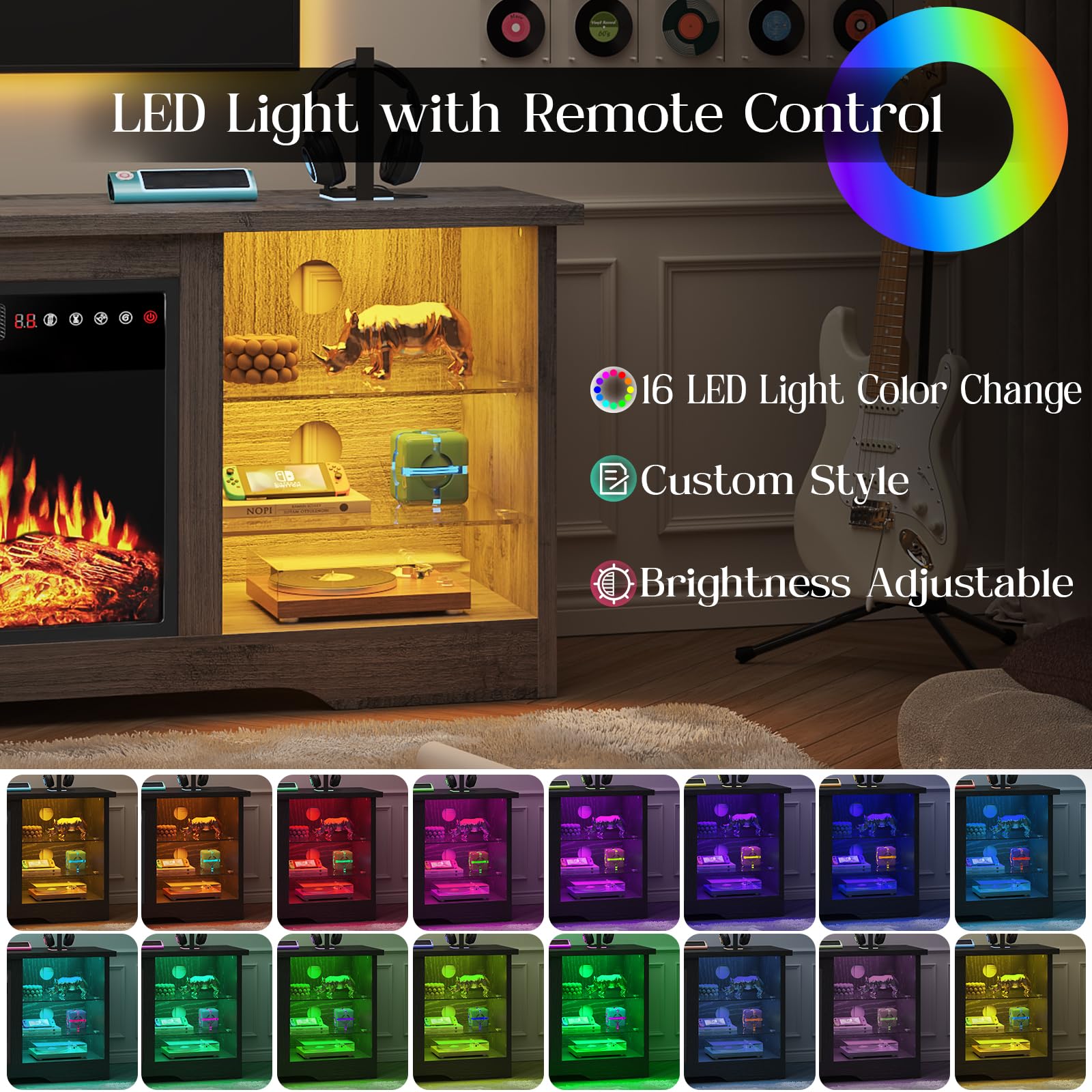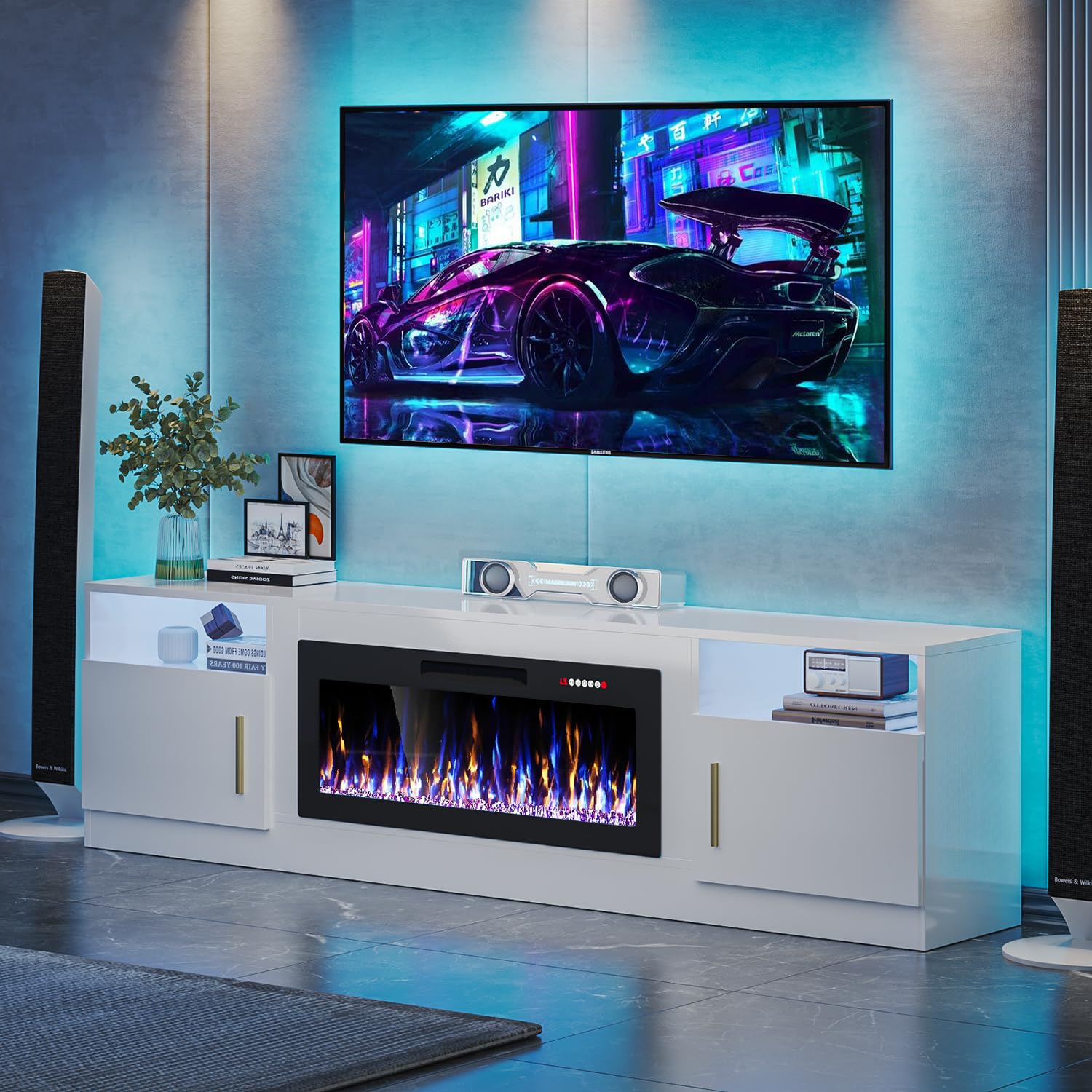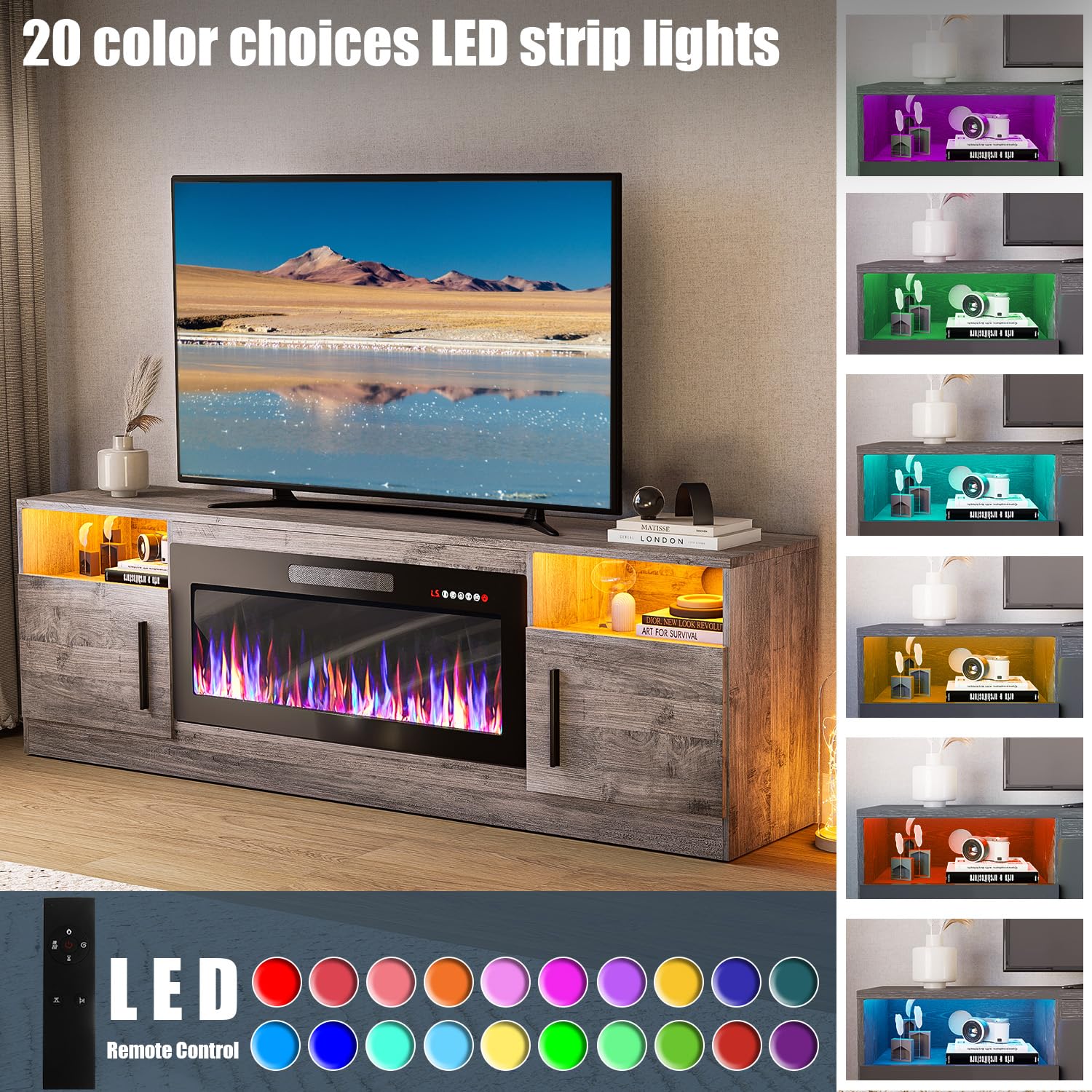 - [TV Stand with Electric Fireplace] :Adopting a 2-in-1 design, combining the TV Stand with the electric fireplace. TV cabinet for TVs up to 80”, and the desktop can bear up to 300 pounds. It comes with a 36-inch electric fireplace,can heat up to a 400-square-foot room, adjustable between 750 watts and 1,500 watts. Make the TV placement more stable and provide a better viewing experience. The electric fireplace has 12 types of flames, and the speed and brightness of 5 types of flames can be adjusted, allowing you to customize various atmospheres.