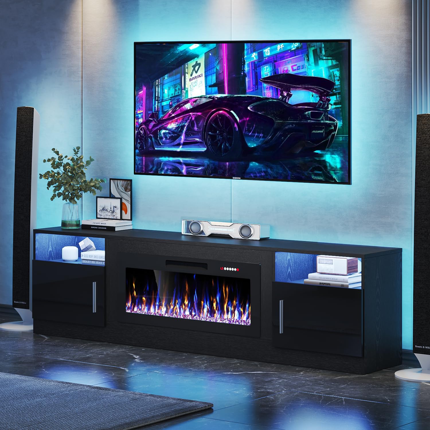 VITESSE Fireplace with TV Stand 36" inch Electric Fireplace Up to 80" TVs, LED Light Entertainment Center, 70" Modern Wood High Gloss with Highlight Storage Cabinet for Living Room (Black)