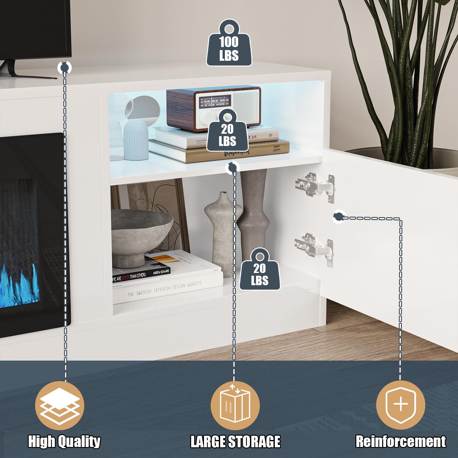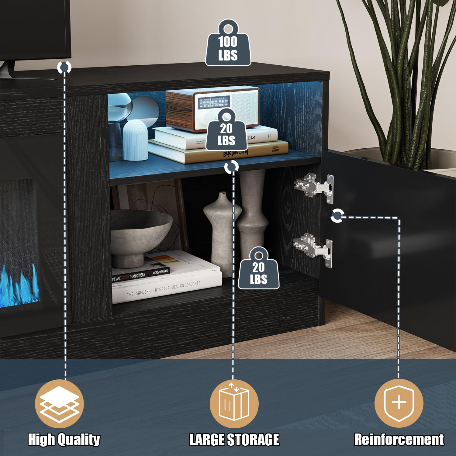 - [Excellent Storage Space Design] :There are two cabinets and two additional storage spaces on both sides of the TV cabinet, providing you with more convenience. You can put your own items, such as books and cameras, in it. There is additional space above the cabinet for your belongings, making your TV cabinet look cleaner and more beautiful.